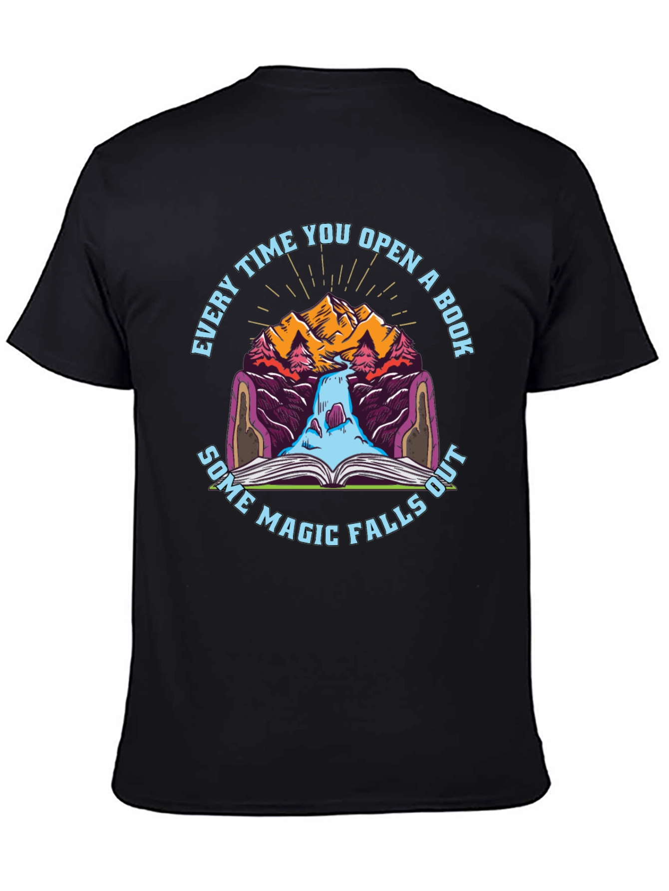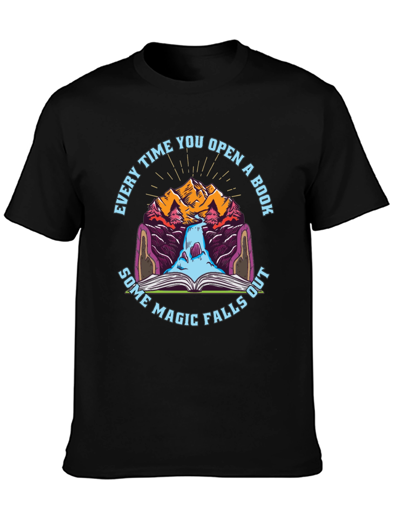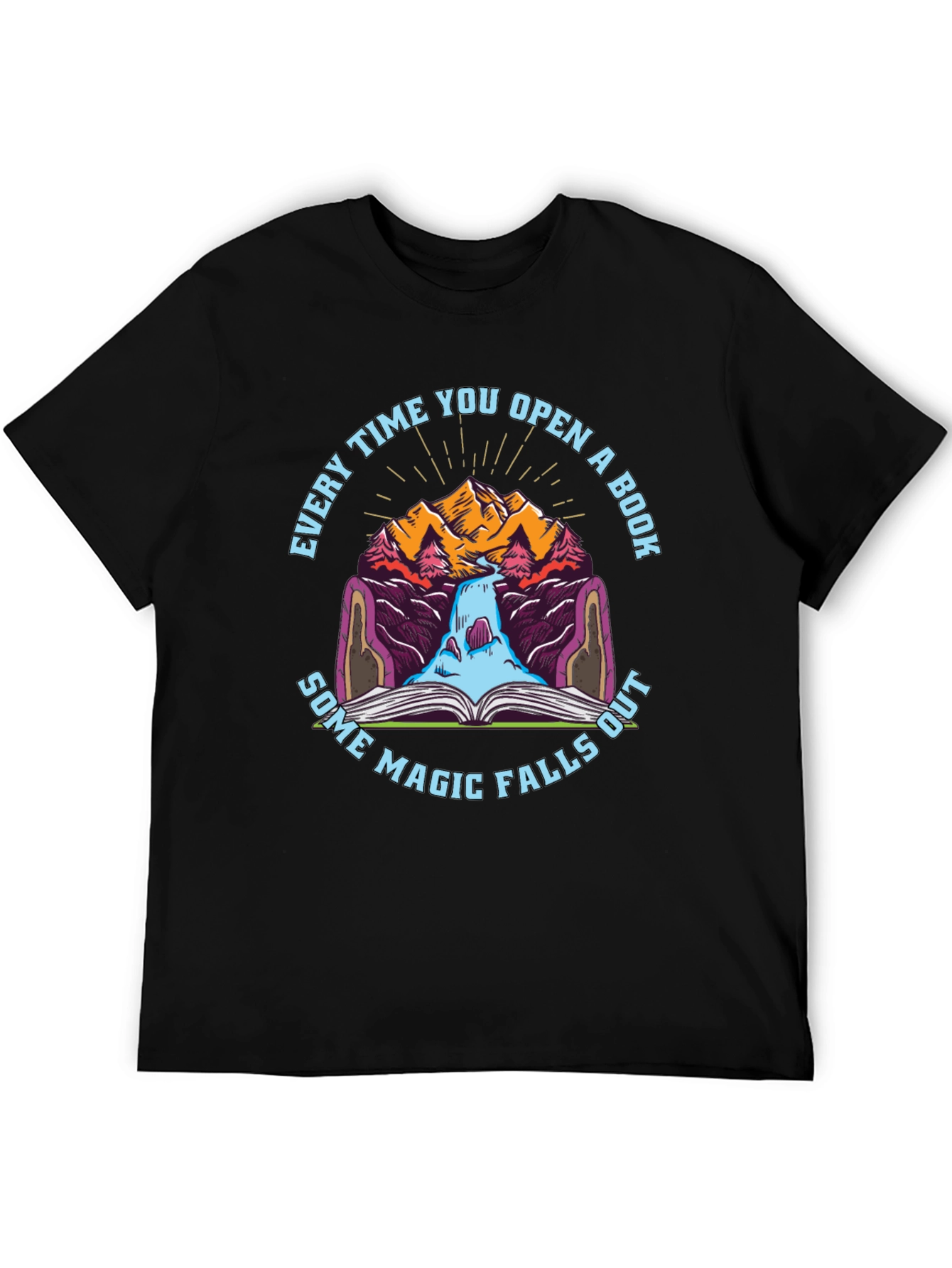This unique black t-shirt features a captivating design for book enthusiasts. The graphic showcases an open book with a magical waterfall cascading out of it, set against a backdrop of stylized mountains and lush scenery. The phrase "Every Time You Open a Book Some Magic Falls Out" encircles the design. The tee is made from a soft, comfortable fabric, ideal for everyday wear. It's a perfect way to express your love for reading and adds a touch of whimsy to your wardrobe. Makes a thoughtful gift for librarians, teachers, or anyone who appreciates the magic of books. Show off your literary style with this eye-catching and comfortable tee!