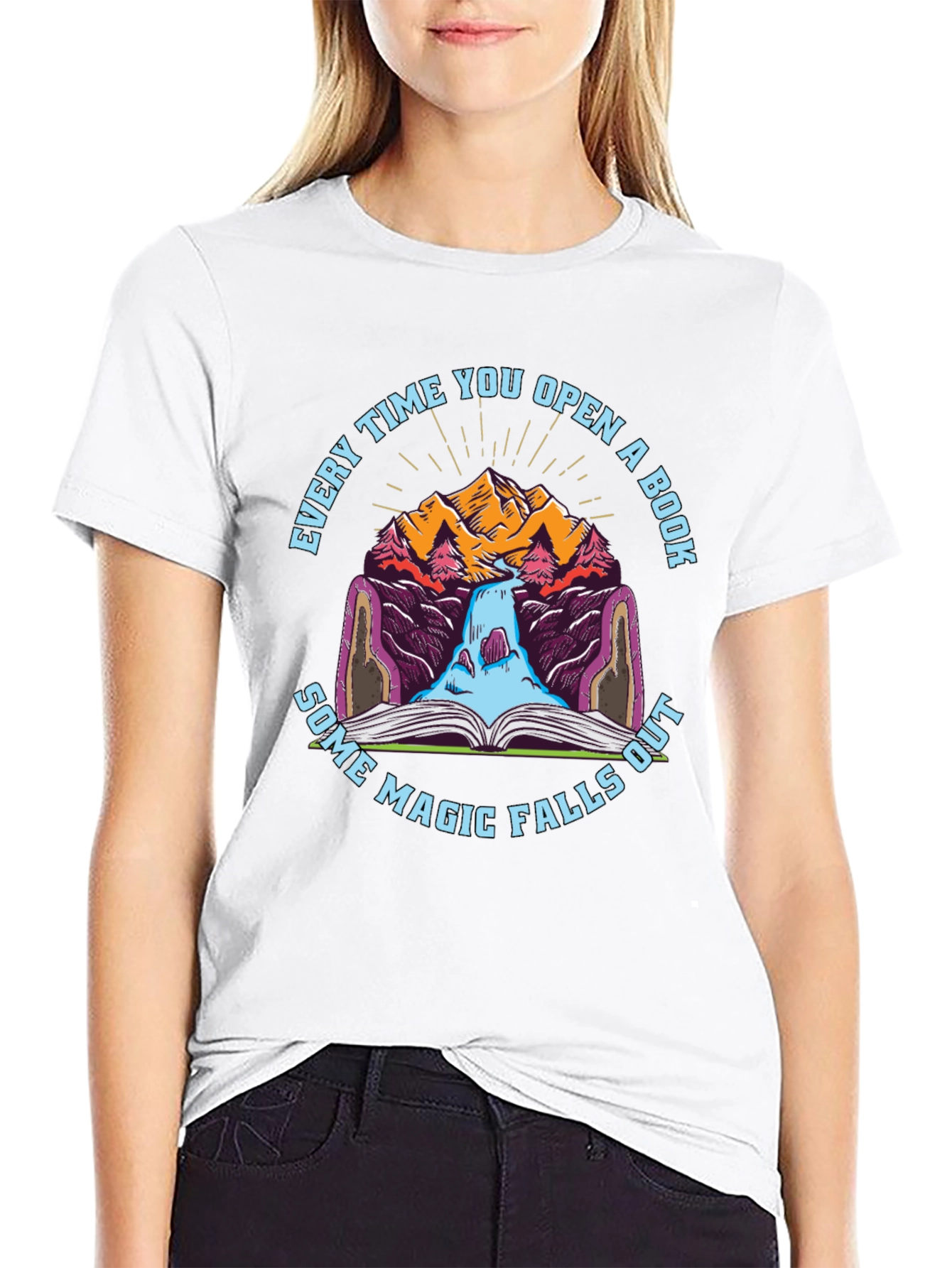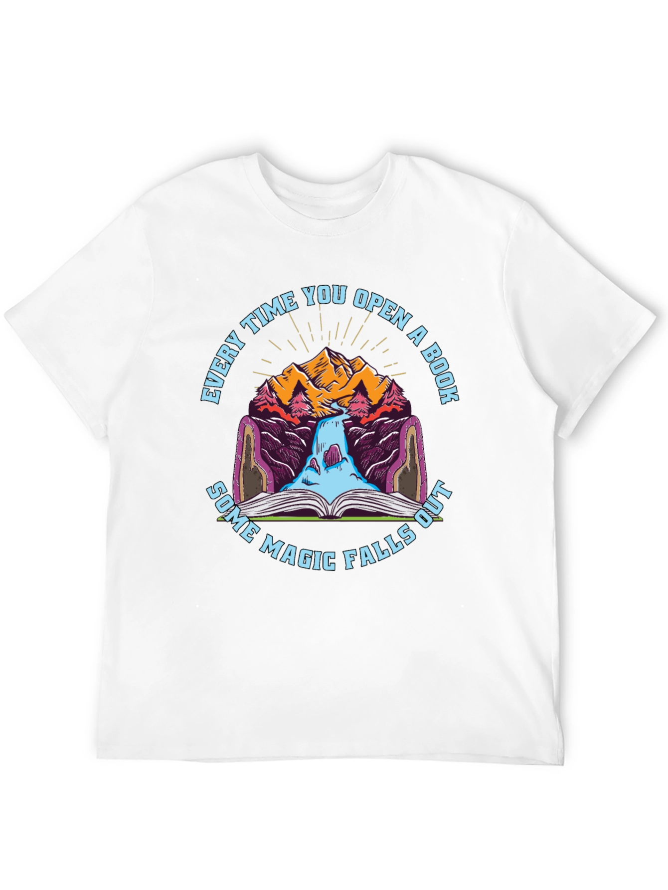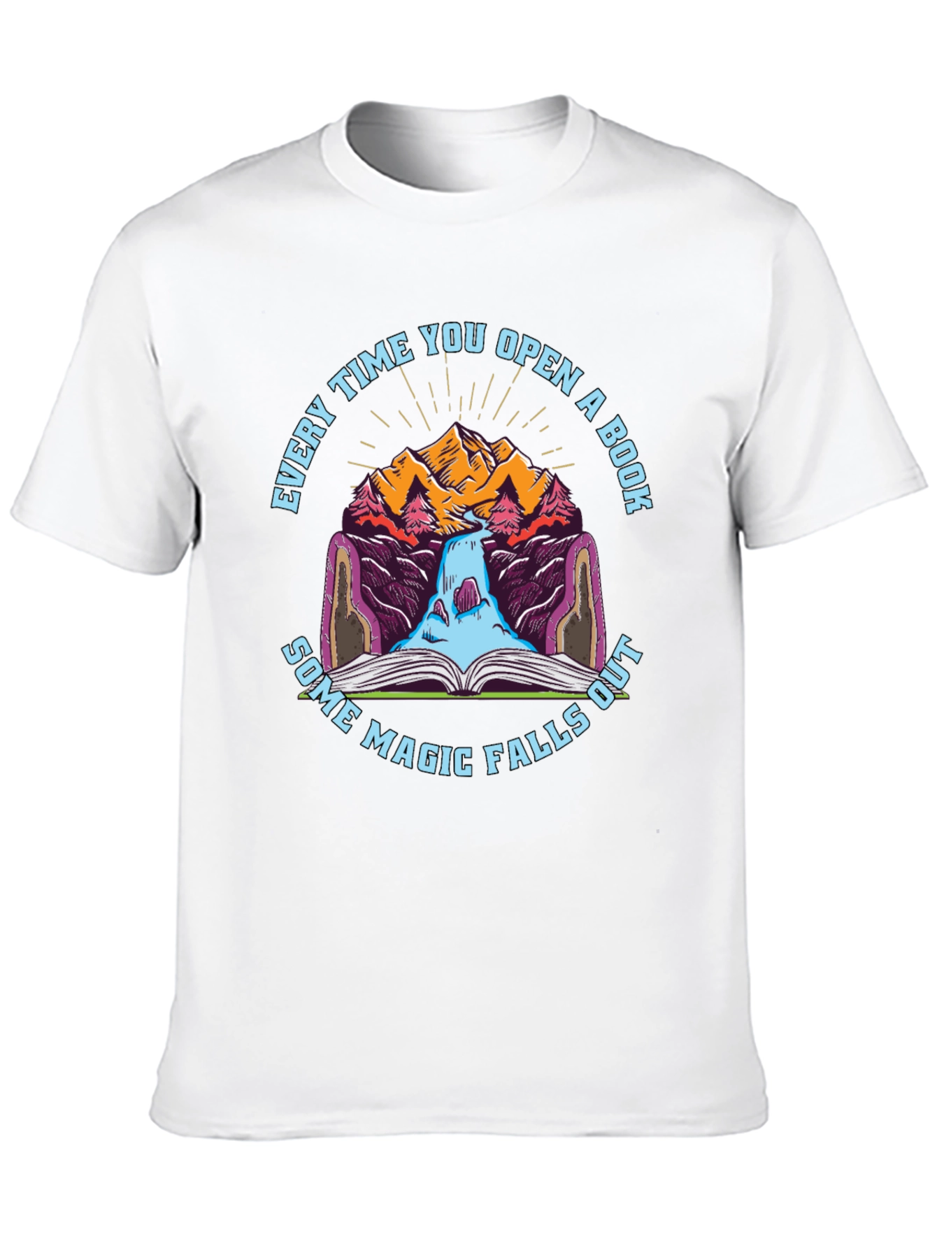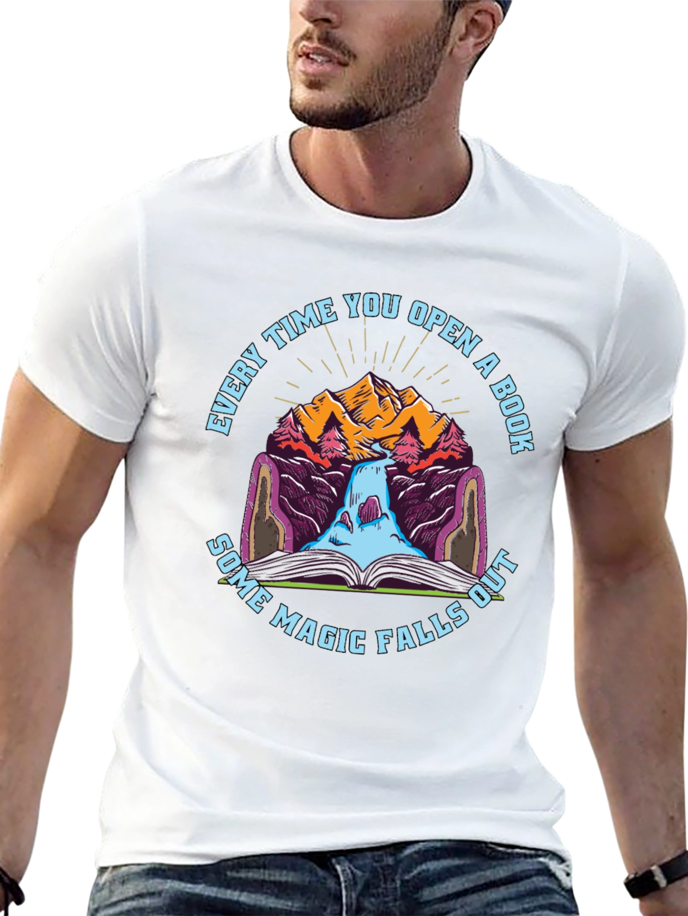 This unique black t-shirt features a captivating design for book enthusiasts. The graphic showcases an open book with a magical waterfall cascading out of it, set against a backdrop of stylized mountains and lush scenery. The phrase "Every Time You Open a Book Some Magic Falls Out" encircles the design. The tee is made from a soft, comfortable fabric, ideal for everyday wear. It's a perfect way to express your love for reading and adds a touch of whimsy to your wardrobe. Makes a thoughtful gift for librarians, teachers, or anyone who appreciates the magic of books. Show off your literary style with this eye-catching and comfortable tee!