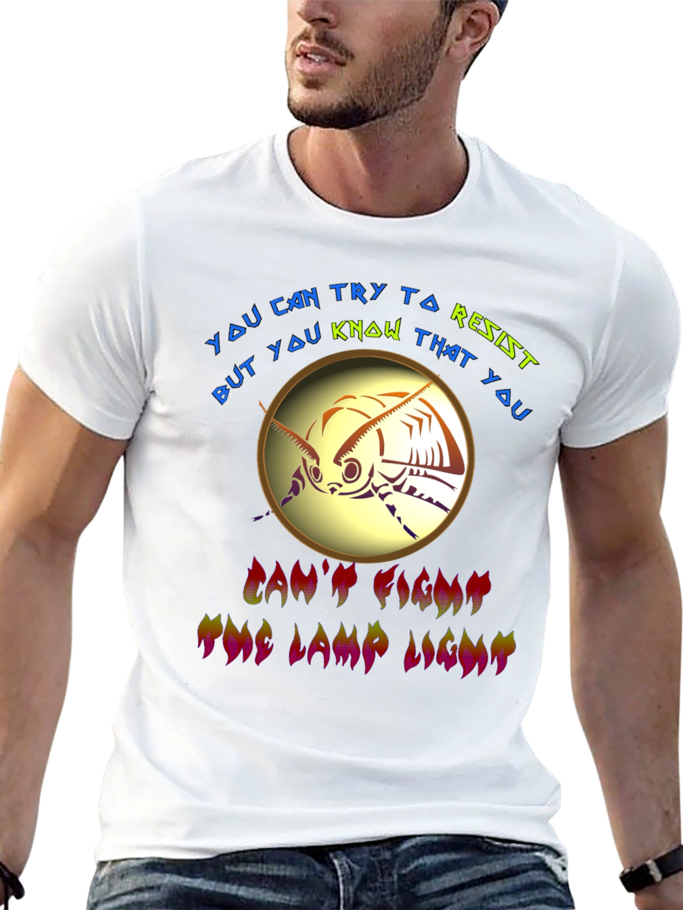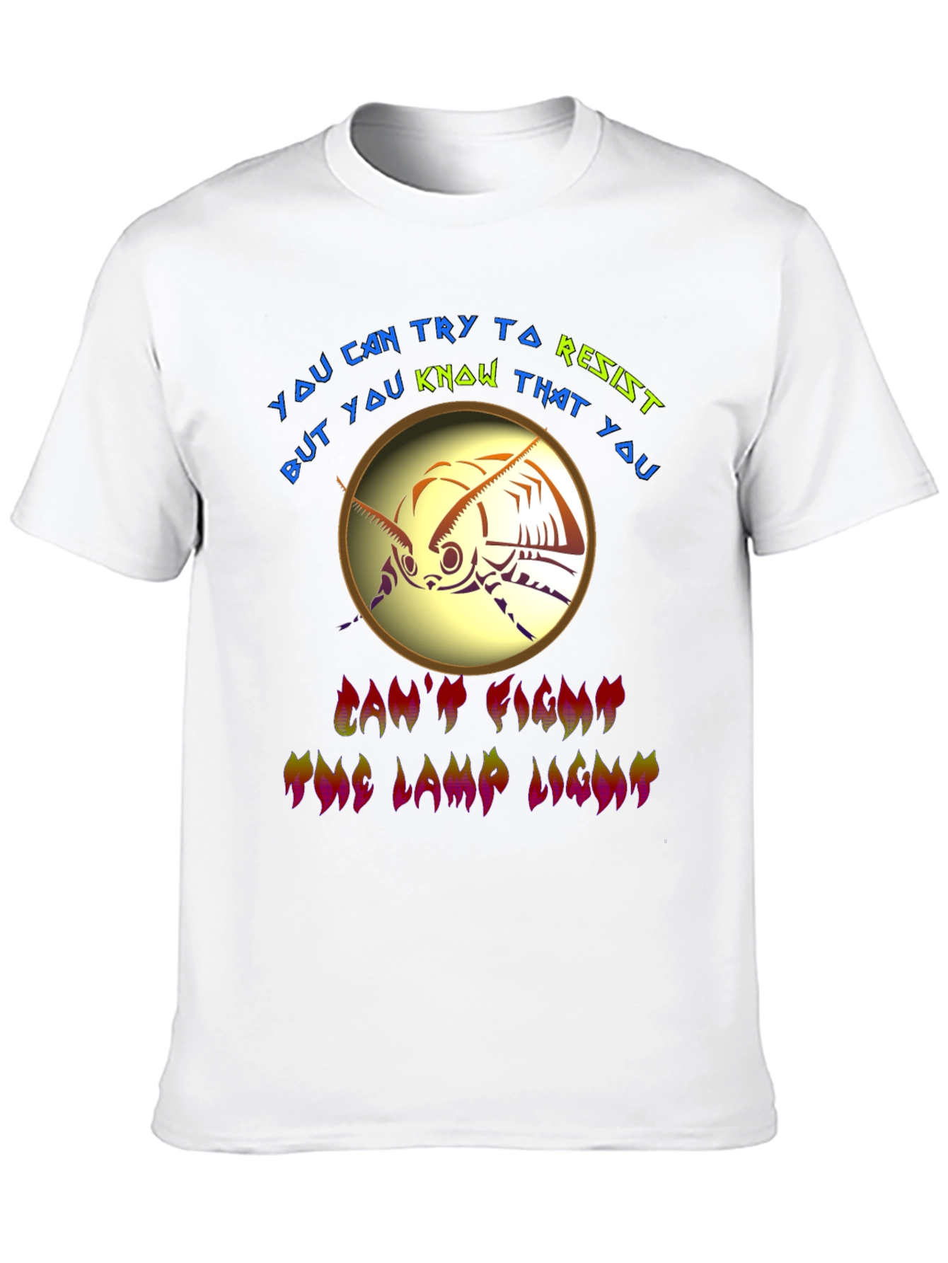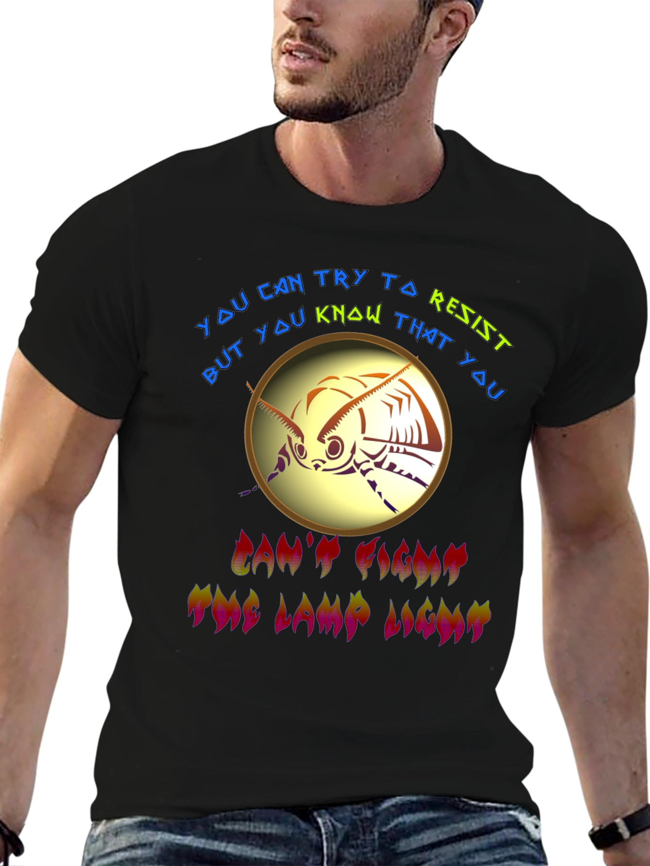Embrace your irresistible allure with this eye-catching graphic tee. The shirt features a stylized moth design encircled by the phrase "You can try to resist but you know that you can't fight the lamp light", rendered in vibrant colors. The black tee showcases the design perfectly, making it a standout piece. Crafted for comfort and style, this tee is perfect for casual wear, concerts, or making a bold statement. It's a fun, unique way to express your personality and draw attention wherever you go. Wear your magnetism proudly!