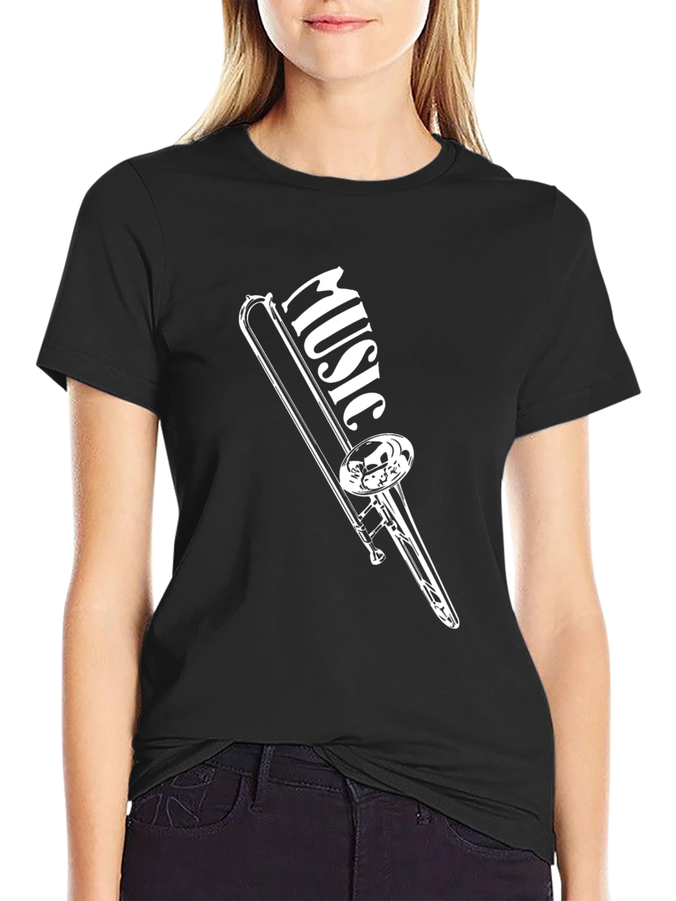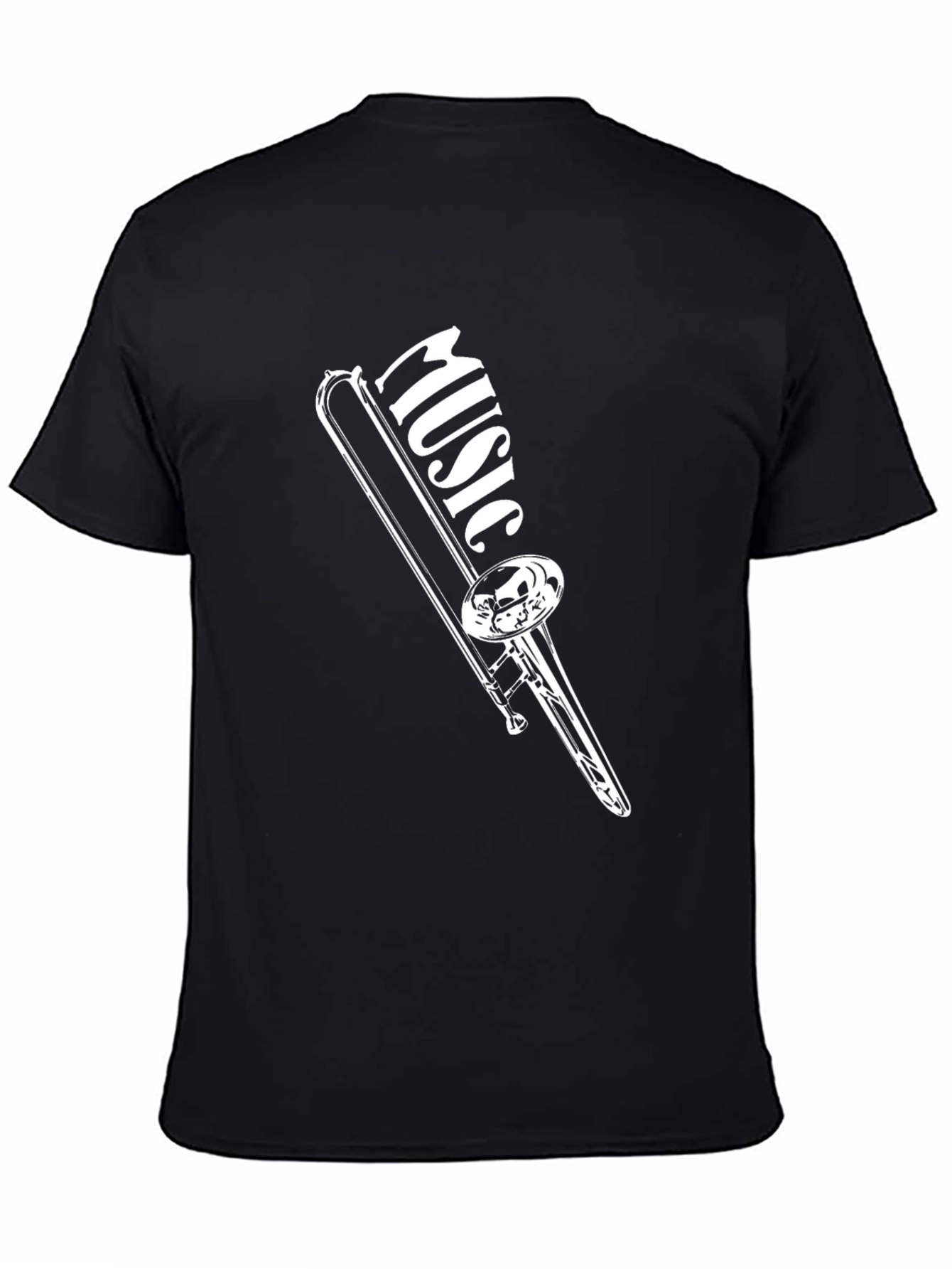 Show your love for music with this stylish black t-shirt. Featuring a unique design of a trombone with the word "MUSIC" integrated into the instrument's design, this shirt is perfect for musicians and music enthusiasts alike. Made from a comfortable, soft fabric, it's ideal for everyday wear. The bold white graphic stands out against the black background, making it a visually striking piece. Wear it to concerts, rehearsals, or just around town to express your passion for music. Grab yours today and let the world know you're a music lover!