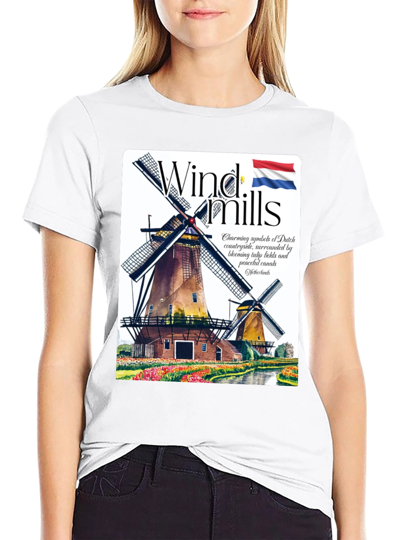 Show off your love for the Netherlands with this stylish graphic t-shirt. The shirt features a vibrant print of classic Dutch windmills surrounded by colorful tulip fields, inspired by vintage travel posters. "Windmills, Charming symbols of Dutch countryside..." is printed above the vivid, picturesque design. Made from soft, breathable cotton, this tee is perfect for casual wear, travel, or as a unique gift for those who appreciate Dutch culture. The classic black tee provides a stark contrast to the vivid design, drawing the eyes. Comfortable and eye-catching, it's sure to become a wardrobe favorite.