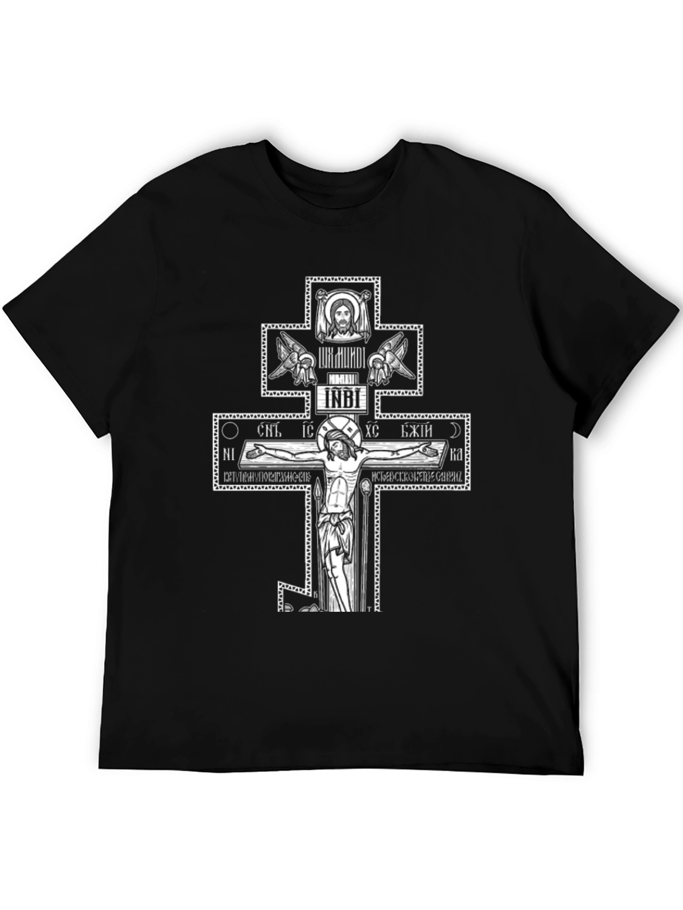 Embrace faith with this unique black t-shirt featuring a detailed Orthodox Cross design. The cross showcases traditional imagery and lettering, creating a visually striking and meaningful statement piece. Made from comfortable, breathable fabric, this tee is perfect for everyday wear or special religious occasions. Show your devotion with style! Ideal for church gatherings, religious celebrations, or casual wear, this shirt is a conversation starter and a testament to your beliefs. A powerful expression of faith and devotion.