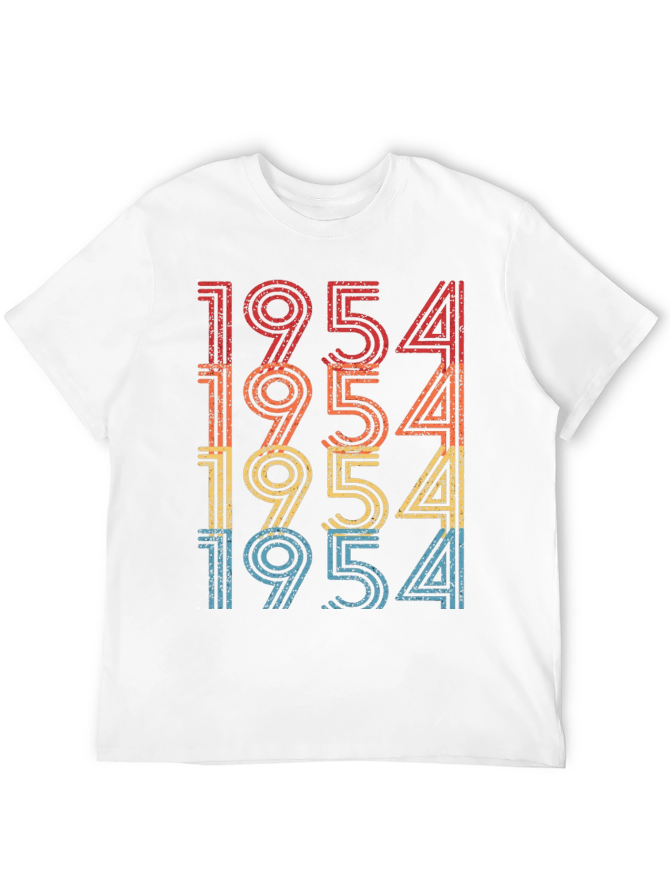 Celebrate in style with this retro-themed 1954 birthday t-shirt. The shirt features a vintage-inspired design with the year "1954" stacked in a colorful, distressed font. The vibrant colors fade from red to yellow to blue, offering a classic look. Made from soft, breathable fabric, this shirt is comfortable to wear all day long. Its simple style makes it easy to pair with jeans, shorts, or casual pants. This t-shirt is perfect for birthday celebrations or casual outings, adding a touch of nostalgic flair to any outfit. It makes a unique gift for those born in 1954!