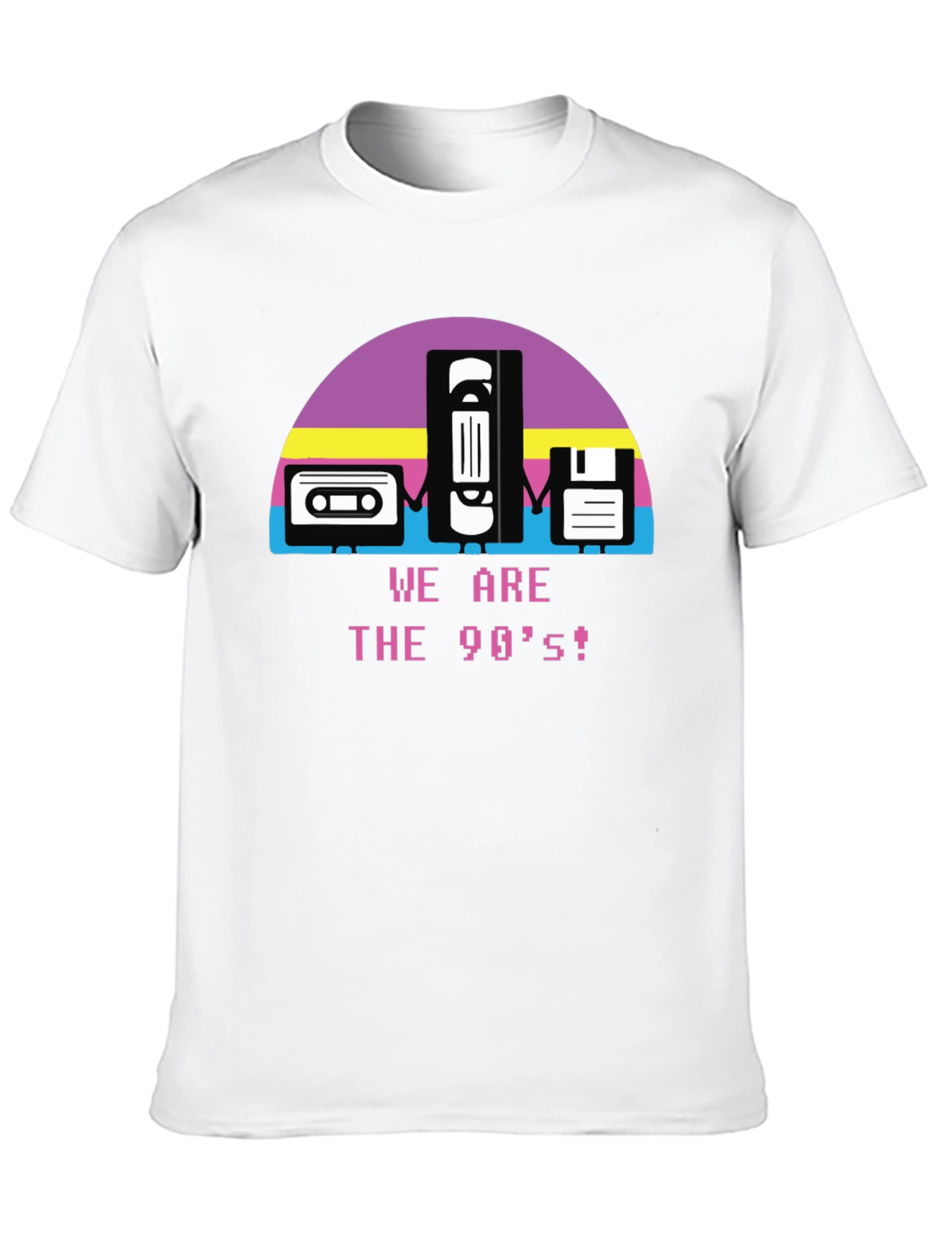 Step back in time with this nostalgic black t-shirt featuring classic 90's tech icons! The vibrant design showcases a cassette tape, VHS tape, and floppy disk holding hands, set against a retro-style rainbow. Below, the text "WE ARE THE 90's!" adds a playful touch, invoking memories of the decade. Made from a comfortable-looking material, this tee is perfect for casual wear and making a statement. Ideal for 90's kids and anyone who appreciates vintage tech, this shirt is sure to spark conversation and turn heads. Show off your love for the 90's with this unique and eye-catching t-shirt!