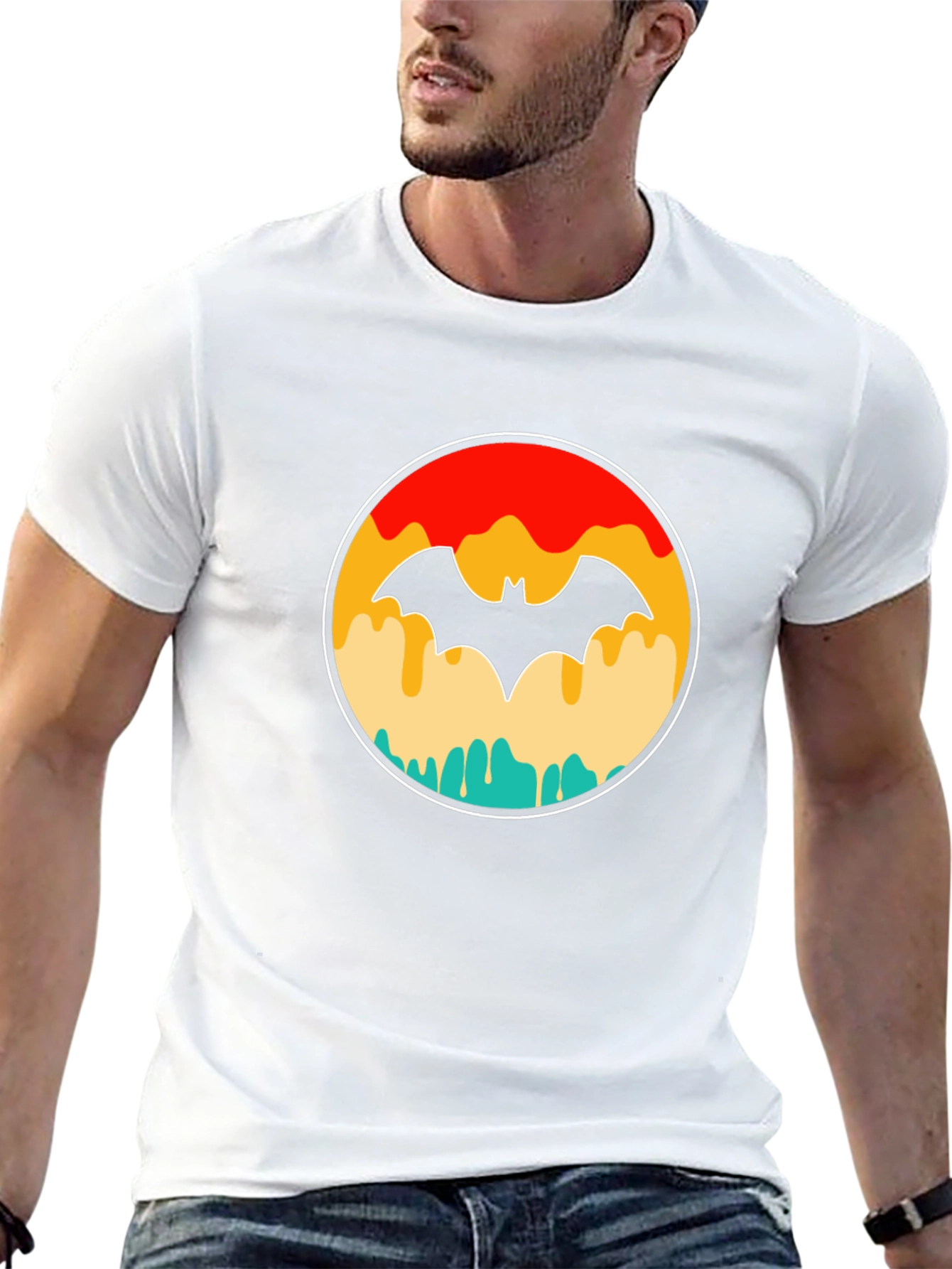 Elevate your style with this unique black T-shirt featuring a retro-inspired Batman graphic. The eye-catching design showcases the iconic Batman silhouette within a colorful, dripping circle, adding a vibrant and artistic touch to your wardrobe. Made from comfortable, breathable fabric, this tee is perfect for casual wear, comic conventions, or simply expressing your love for the Dark Knight. The bold graphic makes it a standout piece, while the classic black background ensures versatility. Pair it with jeans, shorts, or your favorite casual bottoms for a cool and effortless look. A must-have for any Batman fan!