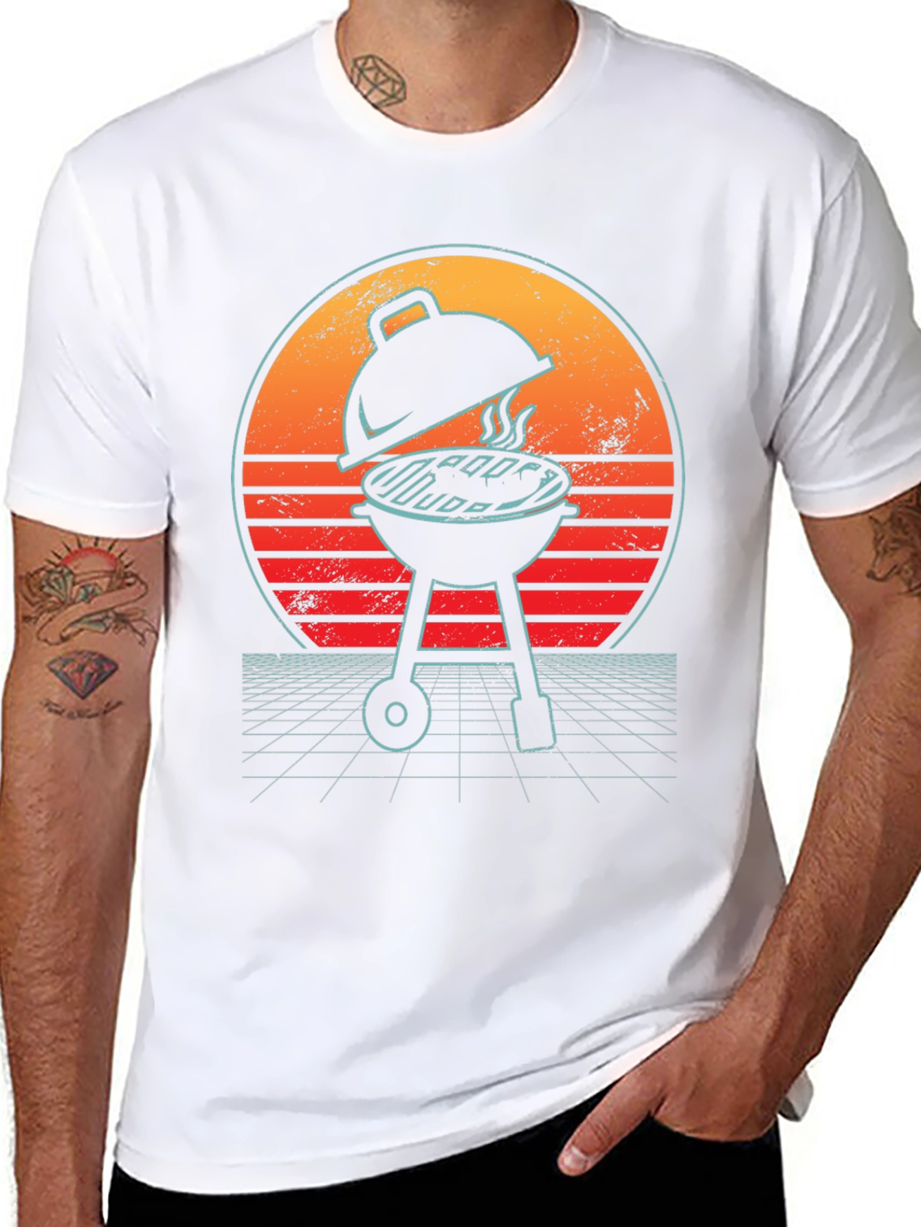 This black t-shirt features a cool retro design perfect for BBQ enthusiasts. The graphic showcases a classic charcoal grill silhouette against a sunset backdrop with horizontal lines and a grid pattern, creating a vintage 80s vibe. Ideal for casual wear, backyard barbecues, or as a gift for grill masters, this t-shirt is a stylish way to show off your love for grilling. Comfortable and eye-catching, it's sure to be a conversation starter at your next cookout. Made from a soft, breathable fabric for all-day comfort.