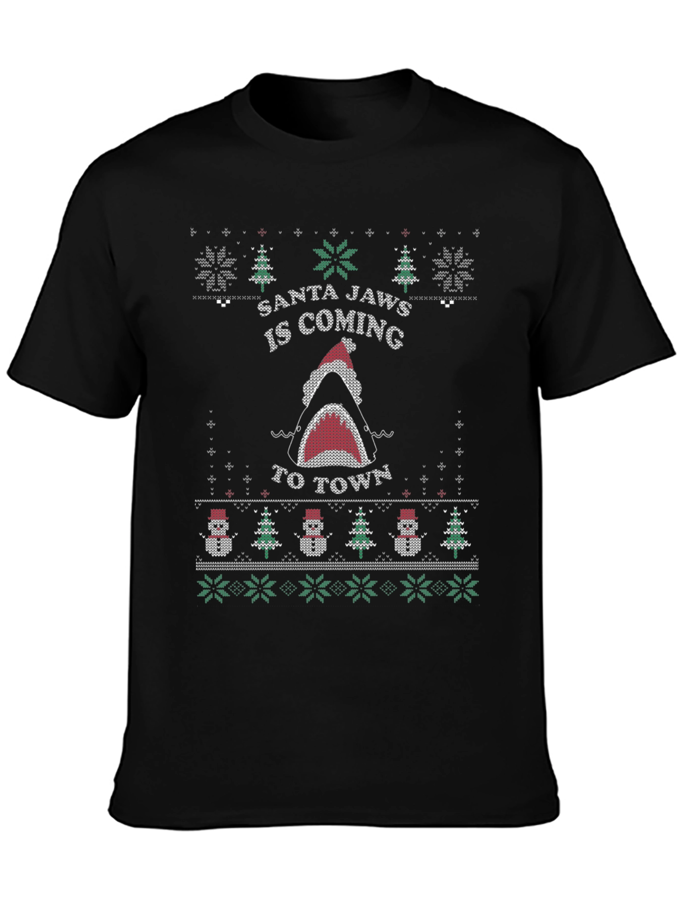 Get ready to make a splash this holiday season with our Santa Jaws T-shirt! This unique tee features a playful "ugly Christmas sweater" style design with a shark wearing a Santa hat. The design is set against a black background and includes Christmas trees, snowflakes, and snowmen, complete with the fun slogan, "Santa Jaws is coming to town". Made from a soft, breathable fabric, this tee offers both comfort and style. Perfect for holiday parties, casual gatherings, or as a fun gift for the shark lover in your life. Show off your quirky side with this festive and eye-catching shirt!