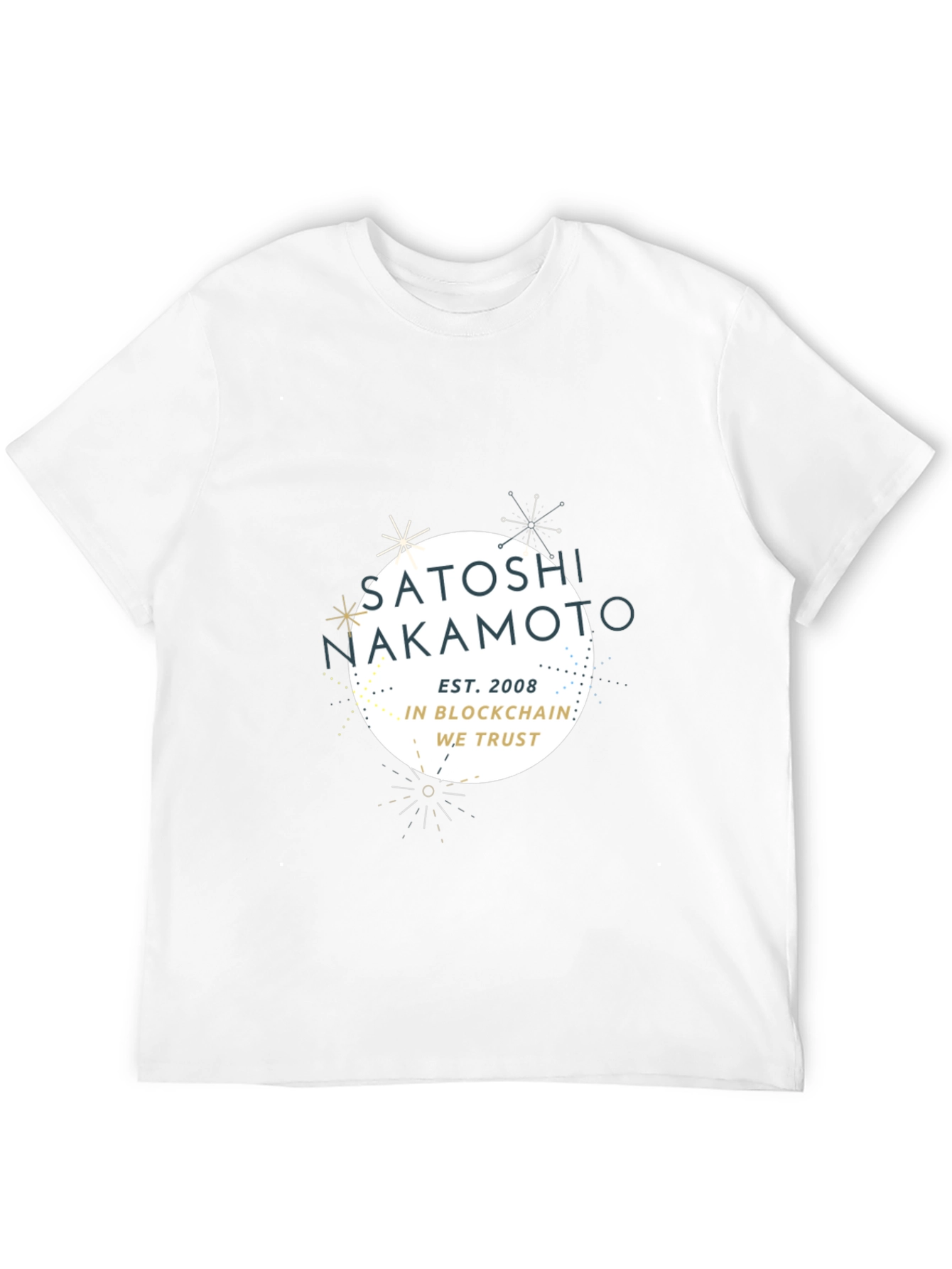 Show your support for Satoshi Nakamoto with this stylish black t-shirt. The shirt features a unique design with the text "SATOSHI NAKAMOTO" in bold, eye-catching letters. "Est. 2008 IN BLOCKCHAIN: WE TRUST" is also present in the design. This comfortable t-shirt is perfect for casual wear or as a conversation starter at tech events. Express your enthusiasm for blockchain technology and show your appreciation for Satoshi Nakamoto with this one-of-a-kind t-shirt.