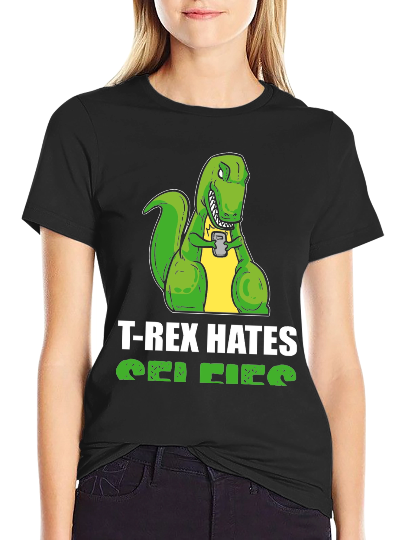 This hilarious black t-shirt features a cartoon T-Rex engrossed in its phone with the witty statement 'T-Rex Hates Selfies' printed across the chest. The eye-catching design combines humor with a unique graphic, making it a standout piece. Crafted from a comfortable fabric blend, it ensures both style and ease of wear. Ideal for casual outings, dinosaur enthusiasts, or anyone who appreciates a good laugh, this tee is sure to spark conversations and turn heads. Show off your quirky side with this fun and trendy statement shirt, perfect for everyday wear!
