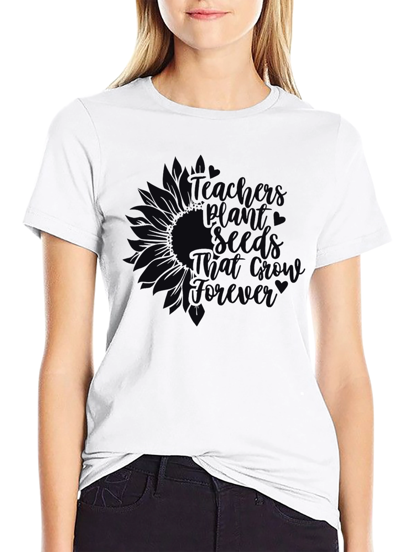 This black t-shirt features a meaningful message for teachers. The design incorporates a sunflower and the phrase "Teachers Plant Seeds That Grow Forever." Ideal for educators who want to show their passion for teaching, this tee is comfortable and stylish. Made from soft fabric, it's perfect for everyday wear in the classroom or casual outings. Get yours today and let everyone know the important role teachers play!