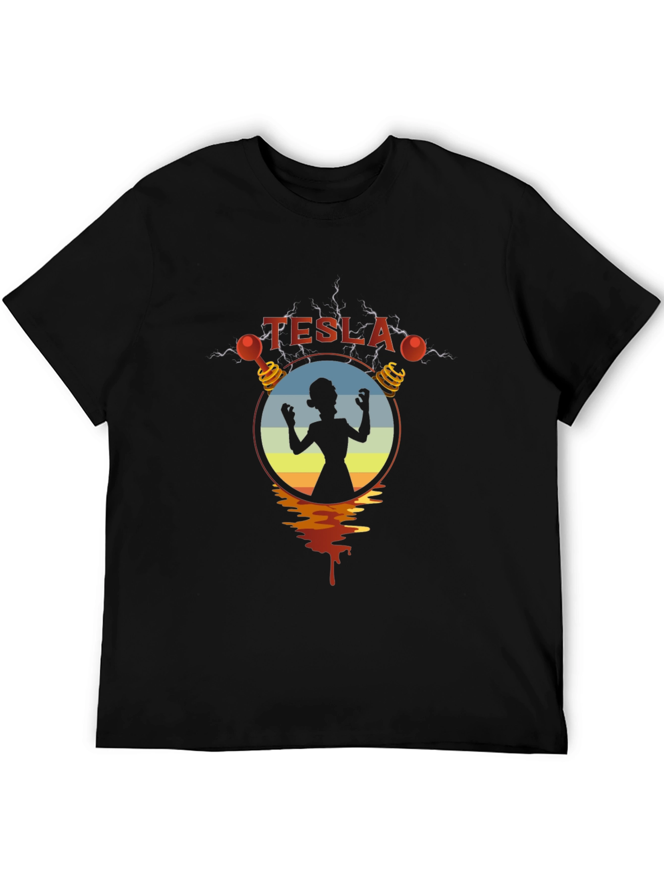 Show off your unique style with this striking black t-shirt featuring a Tesla-inspired design. The graphic showcases a silhouette of a woman encircled within a vibrant sunset-hued gradient and Tesla coils, creating a captivating image. Lightning bolts subtly frame the design, adding an electrifying touch. Made from comfortable, breathable fabric, this tee is perfect for casual wear, concerts, or expressing your love for science and innovation. The distinctive graphic print makes it a standout piece in any wardrobe. Wear it with jeans for a relaxed vibe, or dress it up with a jacket for a night out. A perfect fusion of science and style!