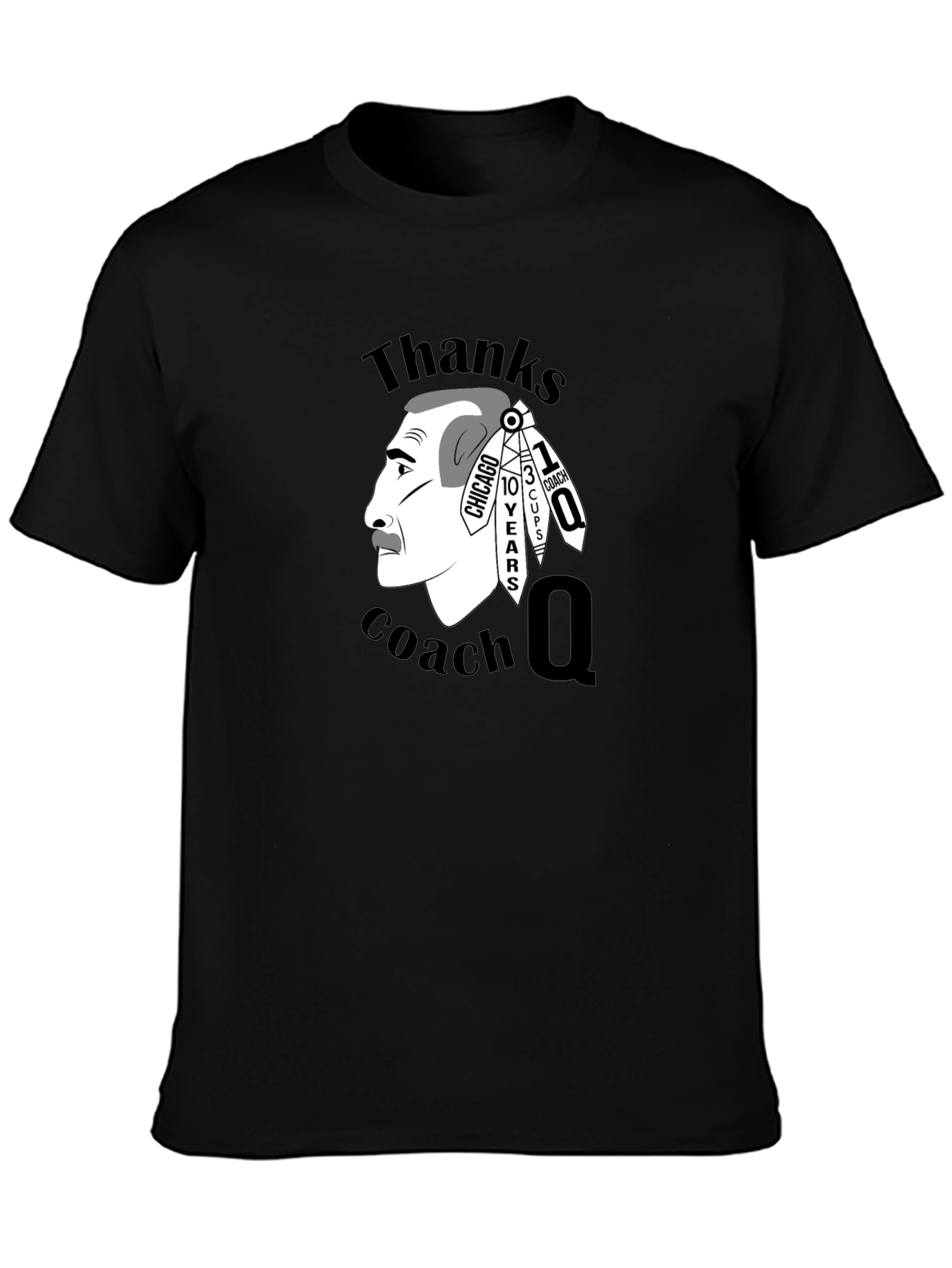 Show your appreciation for Coach Q with this unique black T-shirt. Featuring a distinctive graphic design that creatively honors the coach's legacy with the Chicago Blackhawks. The design includes the iconic Blackhawks logo integrated with symbolic elements representing Coach Q's achievements. Made from comfortable, breathable fabric, this T-shirt is perfect for game days, casual wear, or as a collectible item for die-hard Blackhawks fans. The striking design ensures you'll stand out while paying tribute to a Blackhawks legend. A must-have for any true supporter looking to celebrate a memorable era in team history.