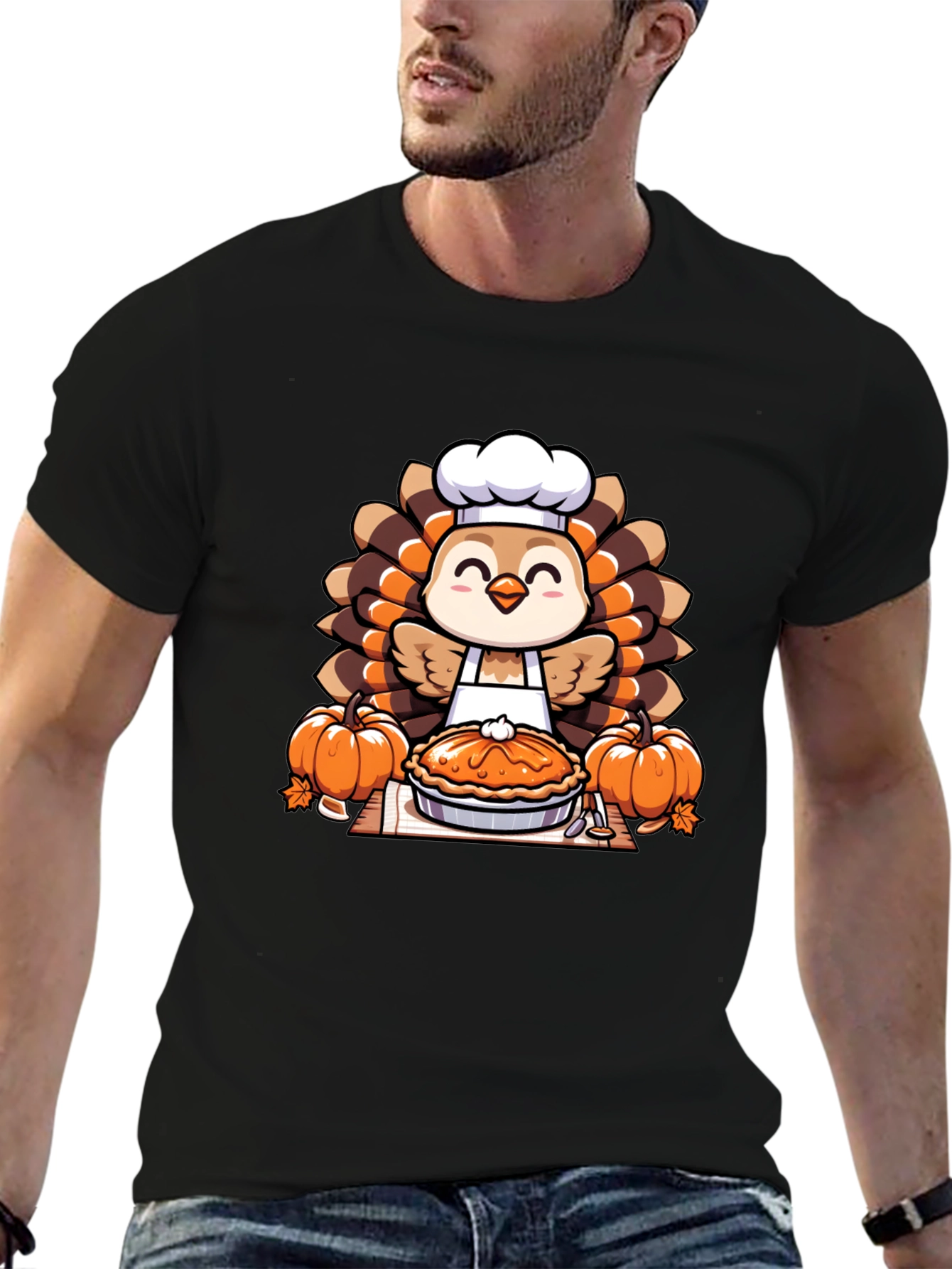 Celebrate Thanksgiving in style with this adorable black t-shirt featuring a cartoon turkey chef design. The festive graphic shows a cute turkey wearing a chef's hat and apron, ready to serve a pumpkin pie. Flanking the pie are two vibrant pumpkins. Made from a comfortable and durable fabric, this shirt is perfect for Thanksgiving gatherings, casual outings, or as a fun holiday gift. Show off your festive spirit with this unique and eye-catching t-shirt! Great for family photos, turkey trots, or just relaxing after a delicious Thanksgiving meal.