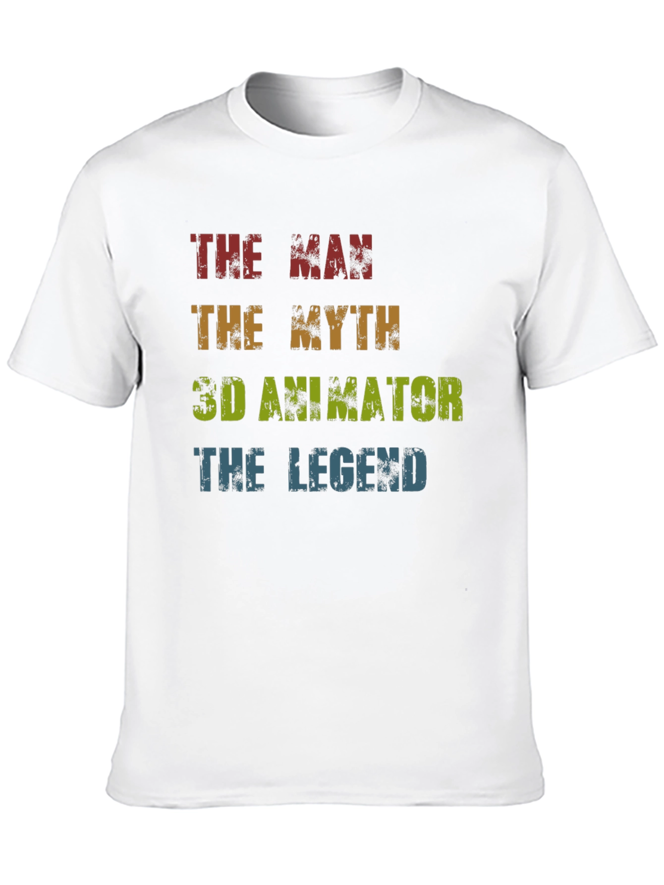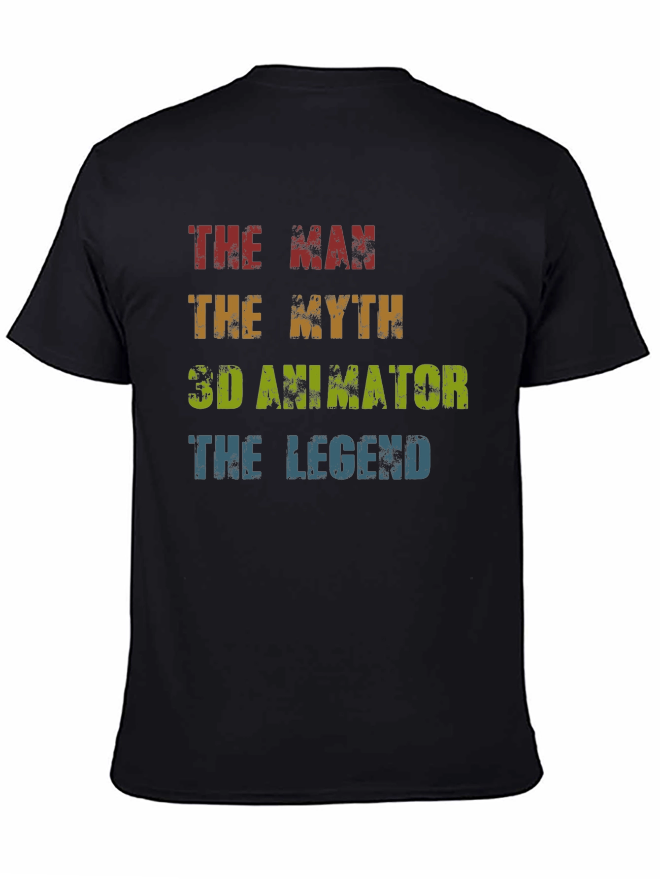 Show off your 3D animator pride with this stylish black t-shirt! The design features the phrase "The Man, The Myth, 3D Animator, The Legend" in a vintage-inspired, distressed font. The text is displayed in a series of colors from red to orange to green to blue, creating an eye-catching effect. Made from a comfortable-looking fabric, this tee is perfect for casual wear, conventions, or as a gift for the 3D animator in your life. Make a statement and celebrate the legendary status of 3D animators everywhere with this unique t-shirt.