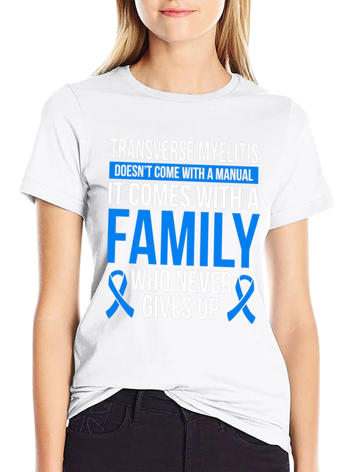 Show your support with this powerful Transverse Myelitis awareness t-shirt. The design features a bold statement: "Transverse Myelitis Doesn't Come with a Manual, It Comes With A Family Who Never Gives Up", accompanied by the blue ribbon, a symbol of awareness. This shirt is perfect for anyone looking to raise awareness, show solidarity, or support a loved one affected by transverse myelitis. Wear it to support groups, awareness walks, or simply as a daily reminder of strength and resilience. Available in a comfortable, classic fit, this tee is a meaningful way to spread hope and support.
