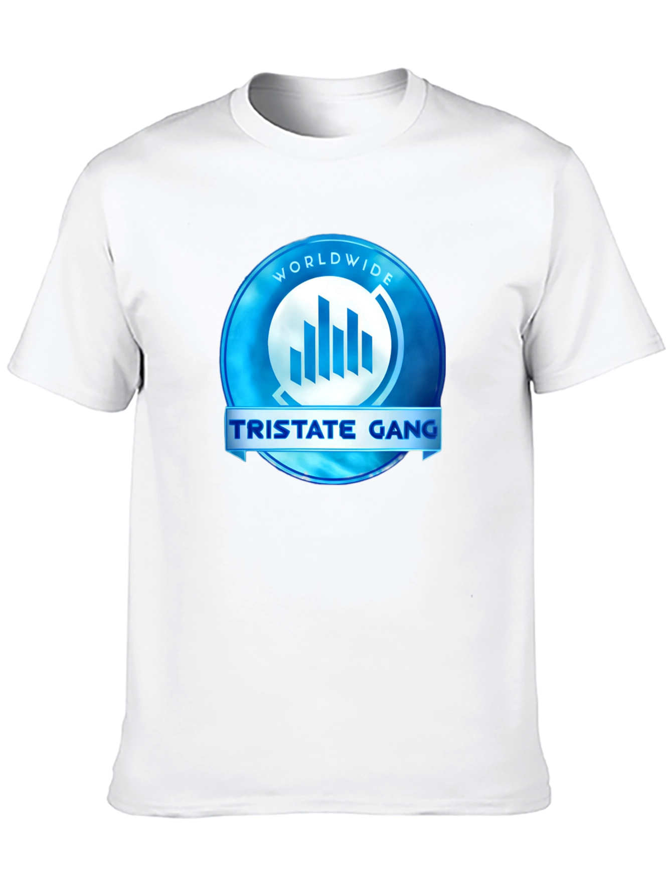 Show your affiliation with this bold TriState Gang t-shirt. The shirt features a prominent circular emblem in shades of blue, with the words 'WORLDWIDE' arching across the top and 'TRISTATE GANG' emblazoned on a banner across the center. The central graphic includes stylized bars, adding a modern touch to the design. Made from comfortable, breathable fabric, this tee is perfect for casual wear, making a statement wherever you go. Stand out from the crowd and show your style with this unique graphic tee.