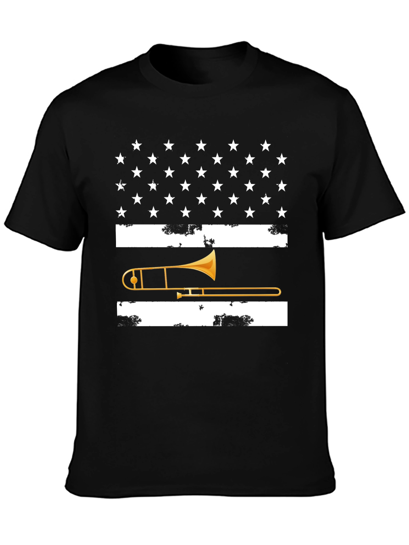 Show off your love for music and patriotism with this unique black graphic tee. The design features a distressed American flag with white stars on a black field, accentuated by bold white stripes, and a vibrant gold trombone taking center stage. This shirt is perfect for musicians, music lovers, or anyone who wants to make a statement. Made from a comfortable, breathable fabric, this tee is ideal for everyday wear. The classic fit makes it versatile for various occasions. Wear it to concerts, rehearsals, or casual outings.
