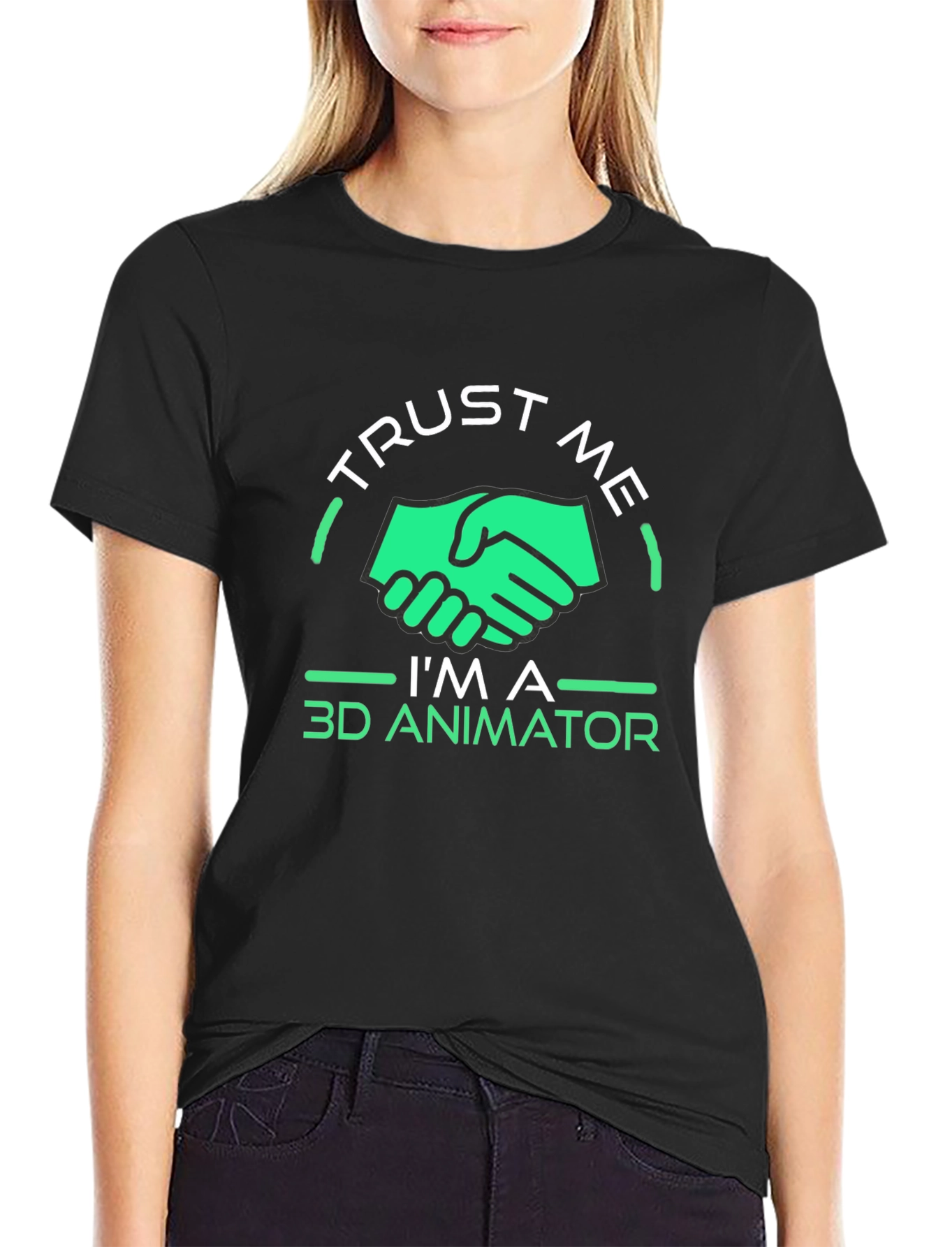 Show off your 3D animation skills with this unique black t-shirt. Featuring a green handshake graphic and the phrase "Trust Me I'm a 3D Animator," this shirt is perfect for animators, designers, and anyone in the creative field. The design is eye-catching and adds a touch of humor to your wardrobe. Made from a comfortable fabric, it's ideal for casual wear, studio sessions, or industry events. Express your passion for 3D animation with this must-have t-shirt.