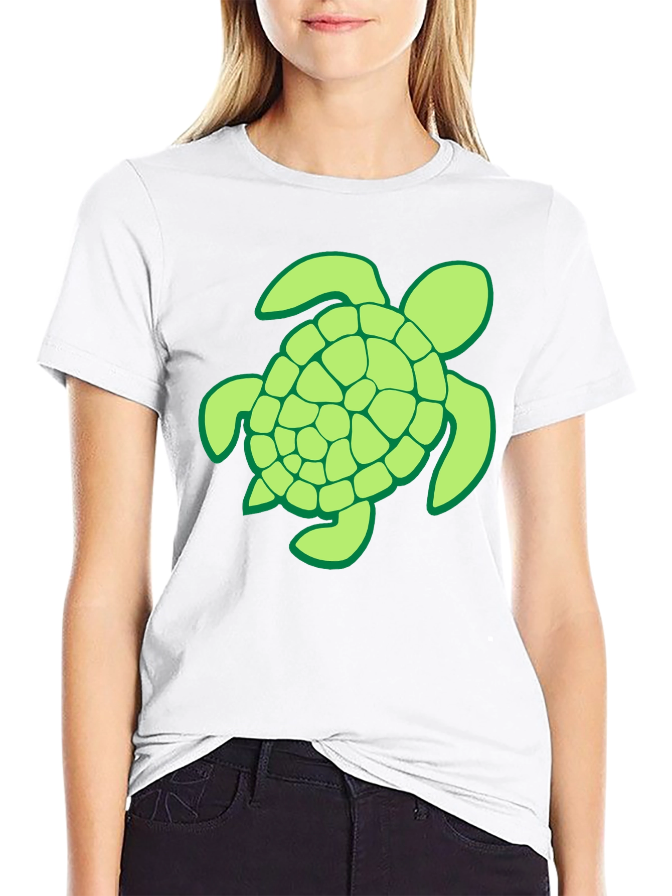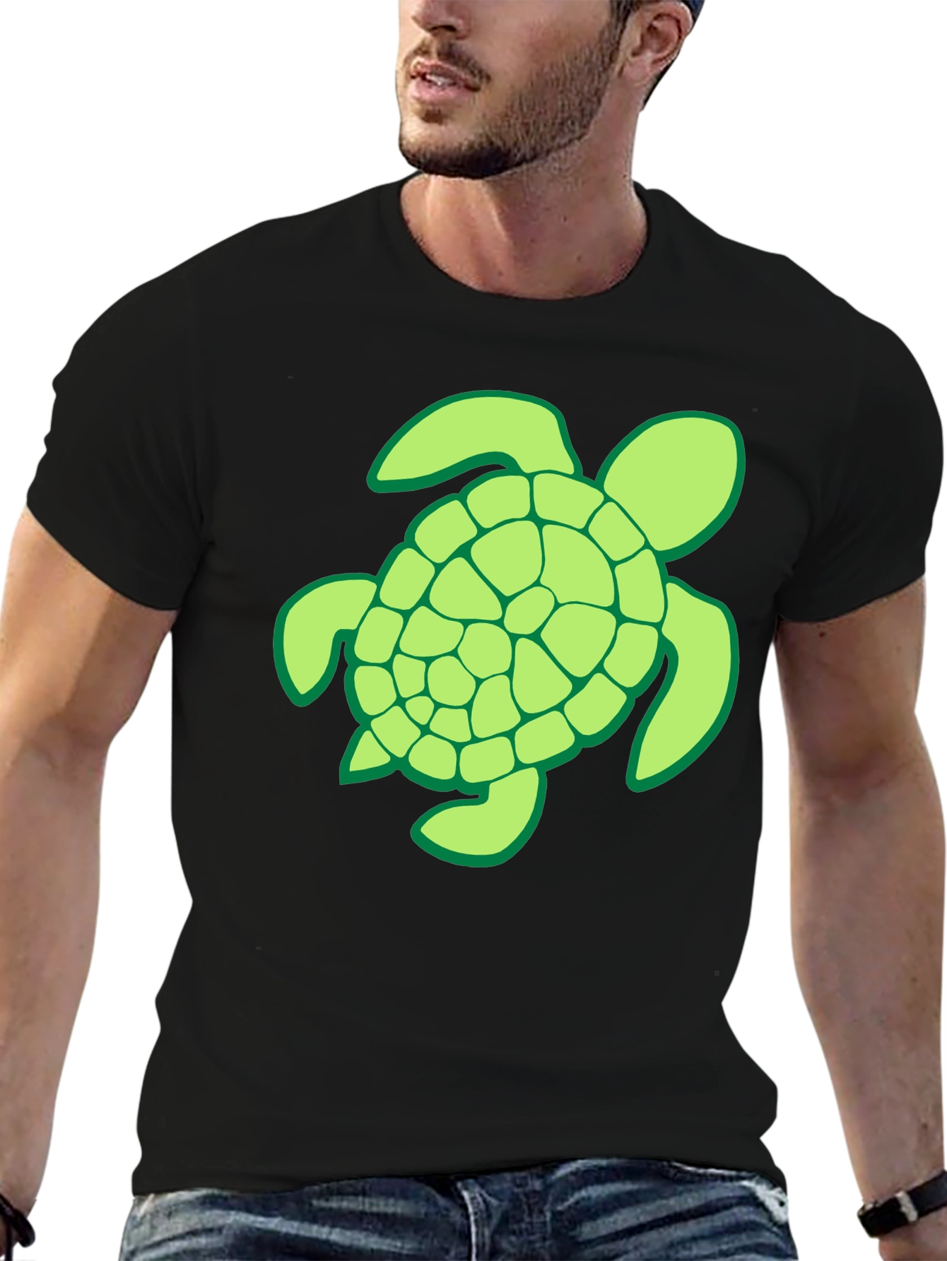 Show off your love for the ocean with this stylish black t-shirt featuring a vibrant, light green turtle graphic. The turtle boasts a segmented shell design with a dark green border. Made from a soft and comfortable fabric, this tee is perfect for everyday wear. Its classic fit makes it versatile for pairing with jeans, shorts, or casual pants. Ideal for beach lovers, nature enthusiasts, or anyone looking to add a unique piece to their wardrobe. This eye-catching t-shirt is sure to turn heads and spark conversation.