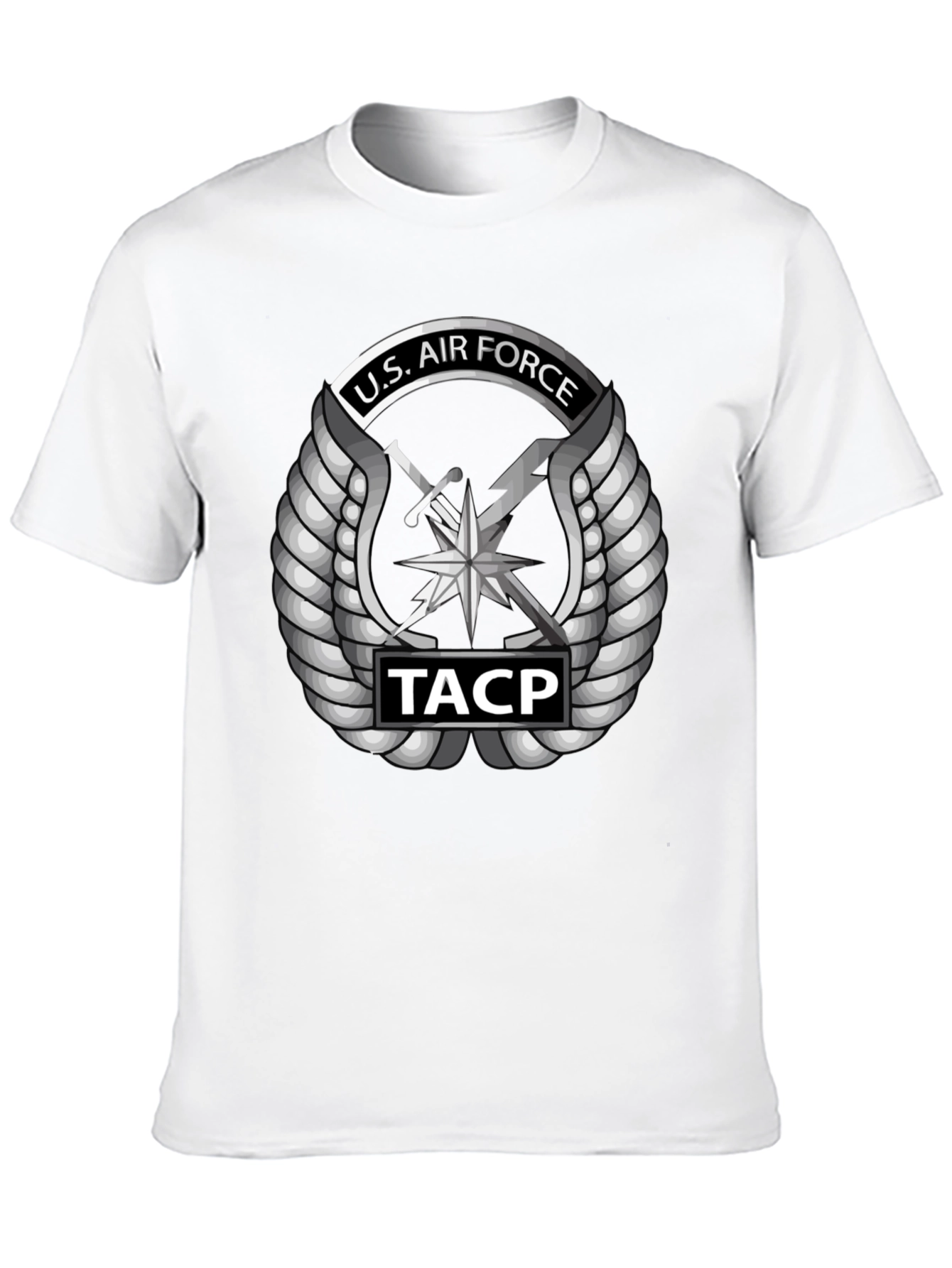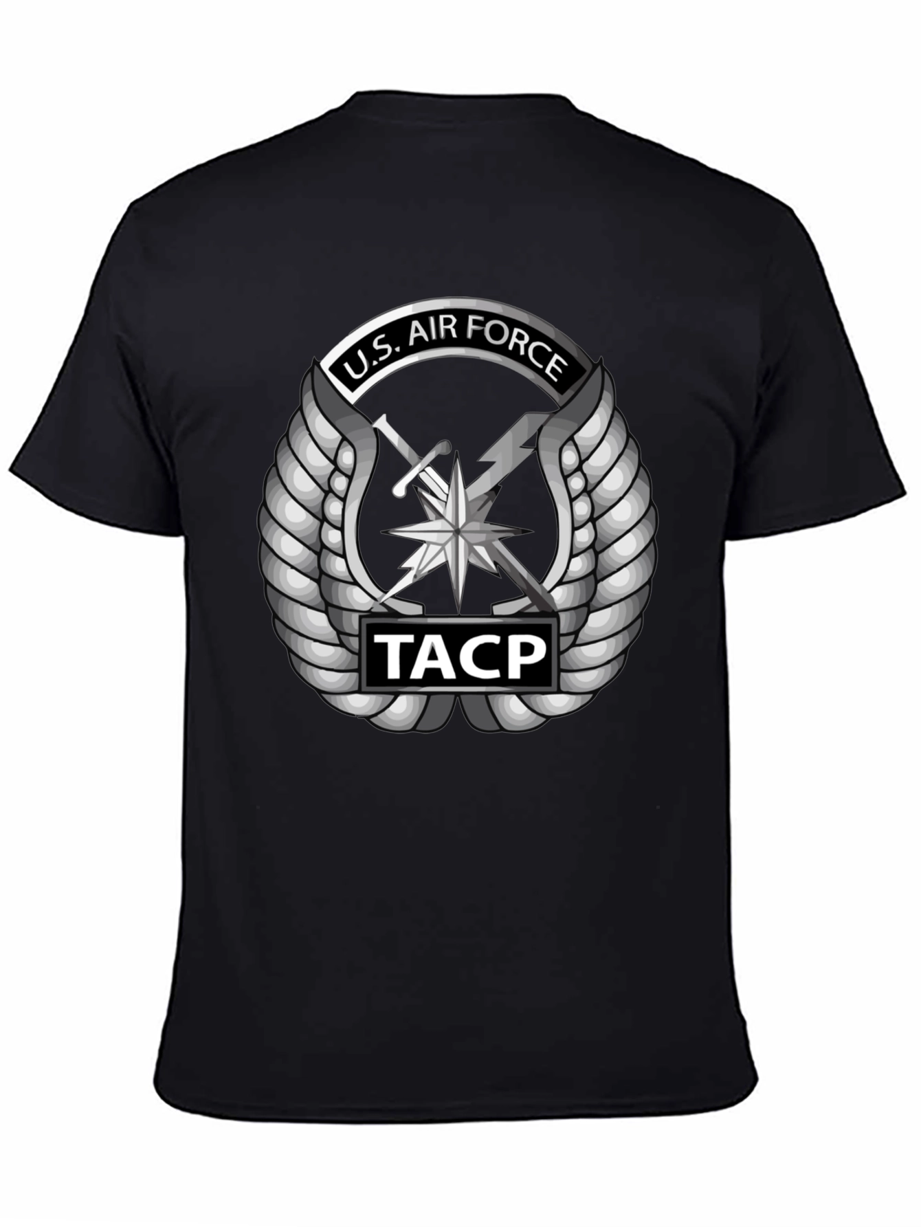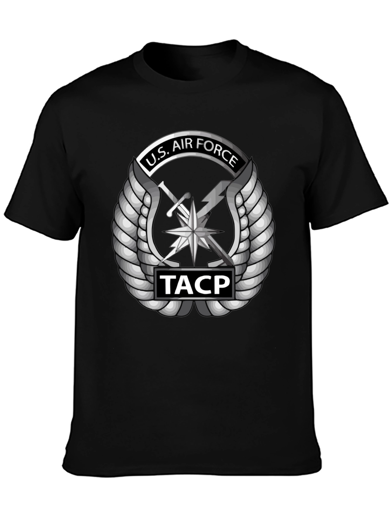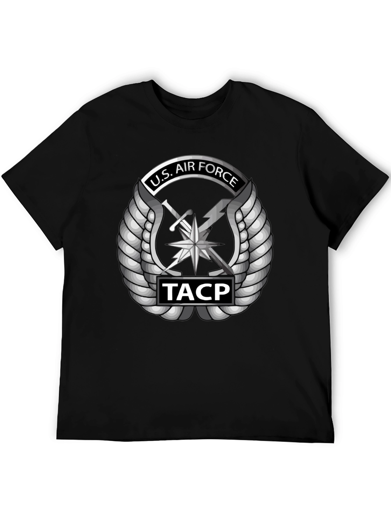 Show your support with this striking U.S. Air Force TACP t-shirt. This black tee features a bold, detailed graphic of the U.S. Air Force Tactical Air Control Party emblem in silver, complete with wings, sword, and lightning bolt, as well as "TACP" insignia. Made from comfortable, breathable fabric, it's perfect for everyday wear, whether you're hitting the gym, running errands, or showing your pride at a military event. The sleek design and classic fit make it a versatile addition to any wardrobe. A great way to honor the U.S. Air Force.