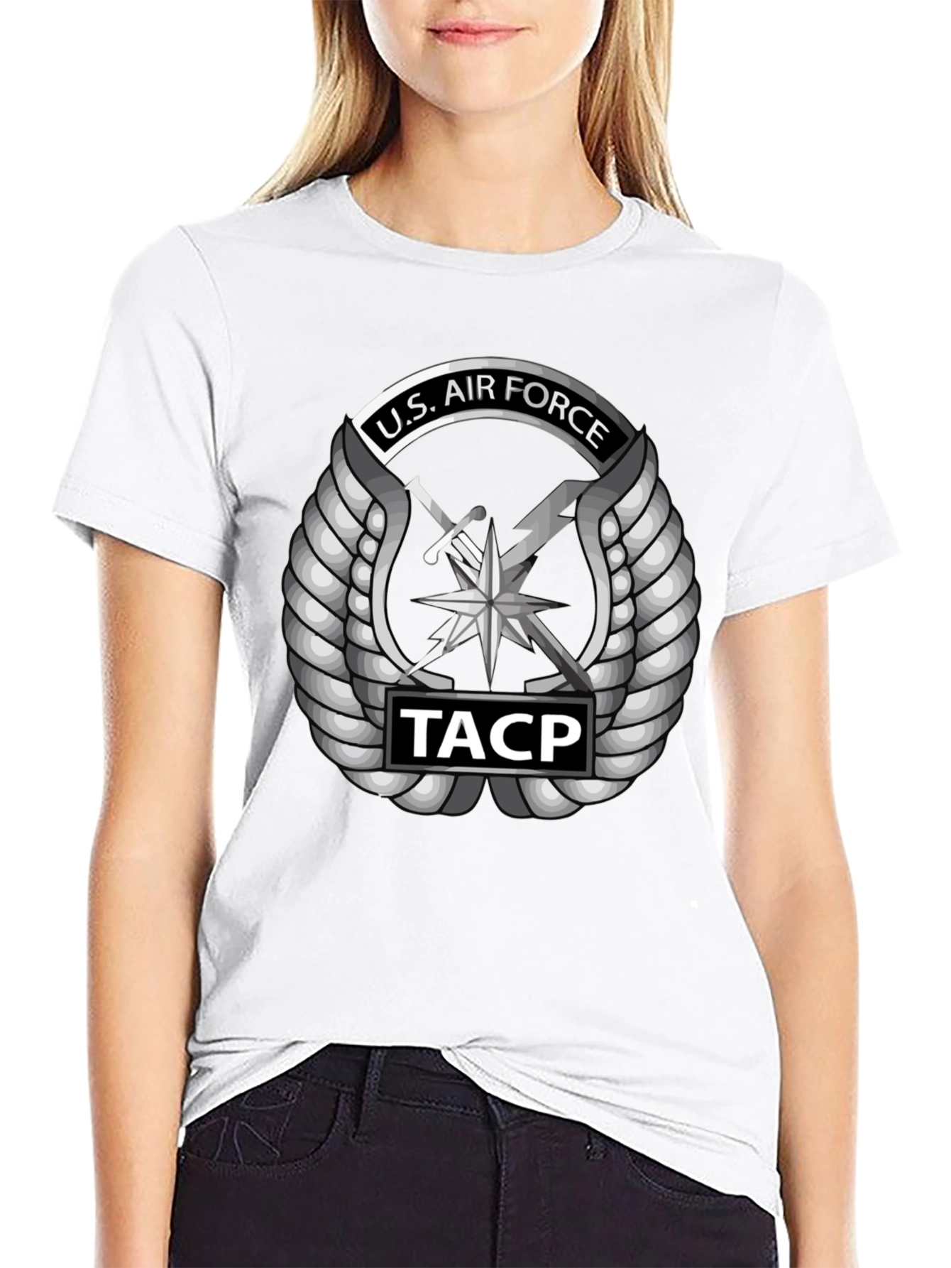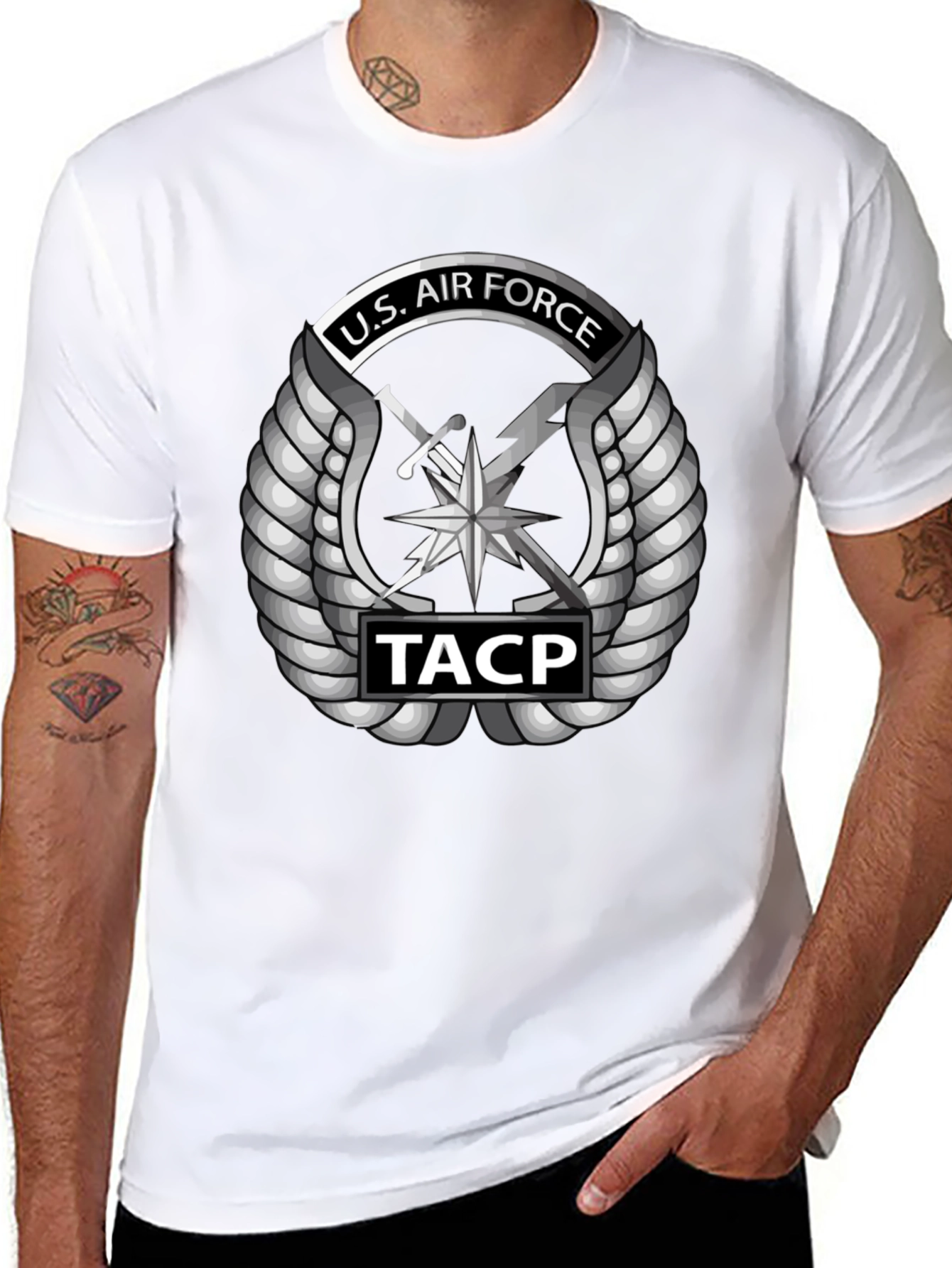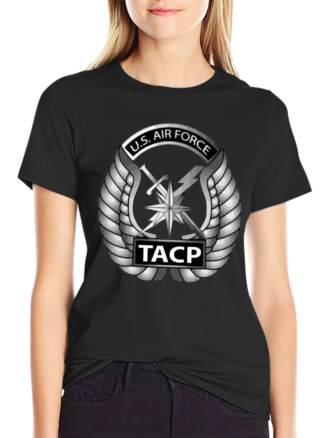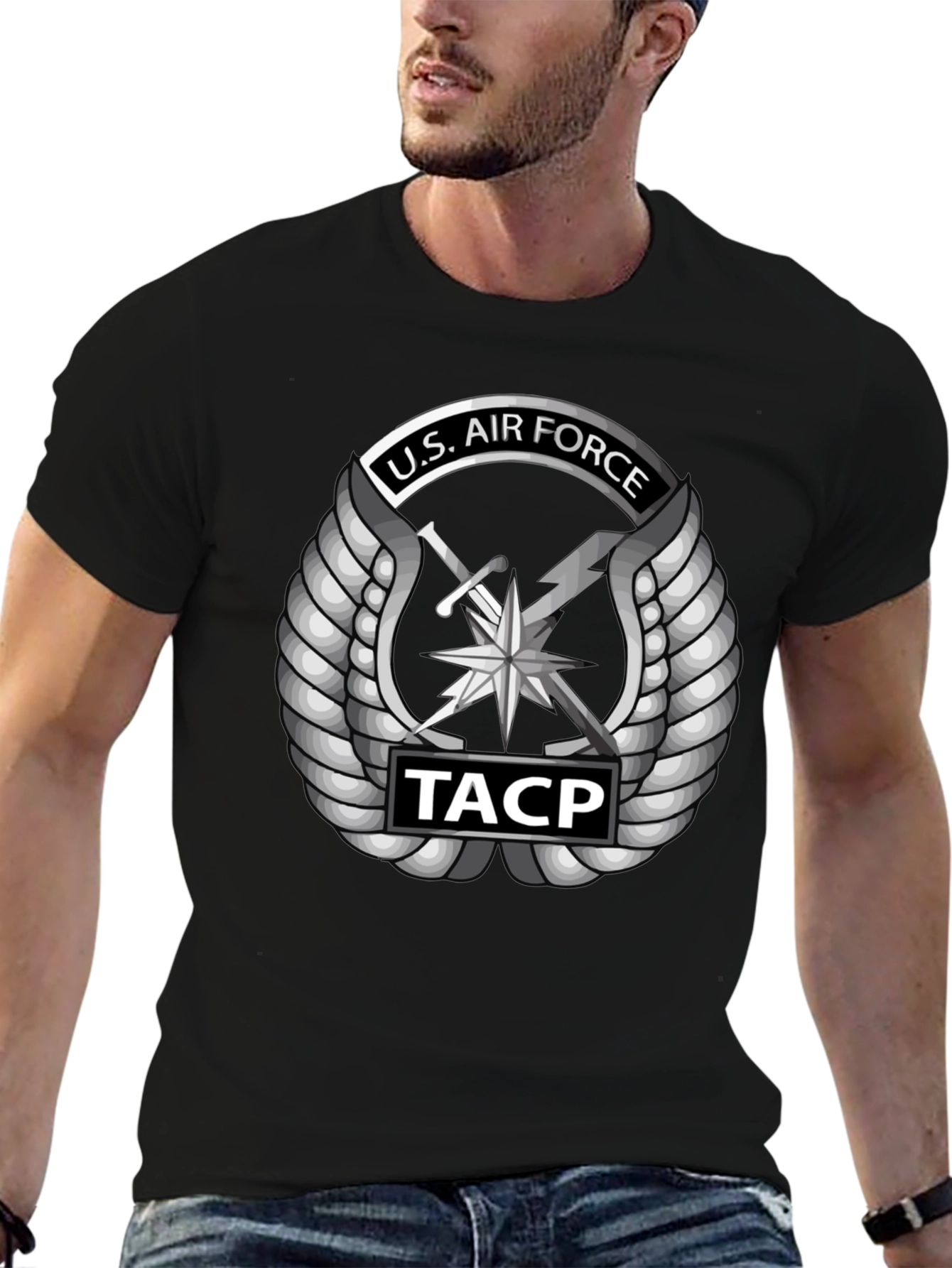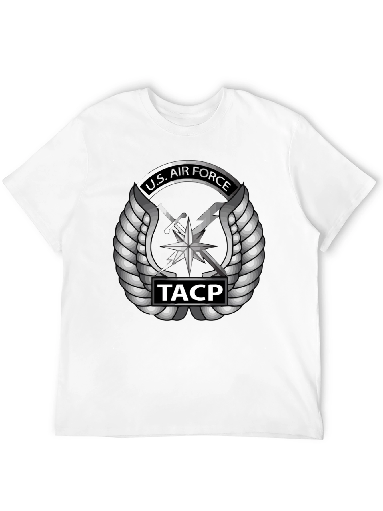 Show your support with this striking U.S. Air Force TACP t-shirt. This black tee features a bold, detailed graphic of the U.S. Air Force Tactical Air Control Party emblem in silver, complete with wings, sword, and lightning bolt, as well as "TACP" insignia. Made from comfortable, breathable fabric, it's perfect for everyday wear, whether you're hitting the gym, running errands, or showing your pride at a military event. The sleek design and classic fit make it a versatile addition to any wardrobe. A great way to honor the U.S. Air Force.