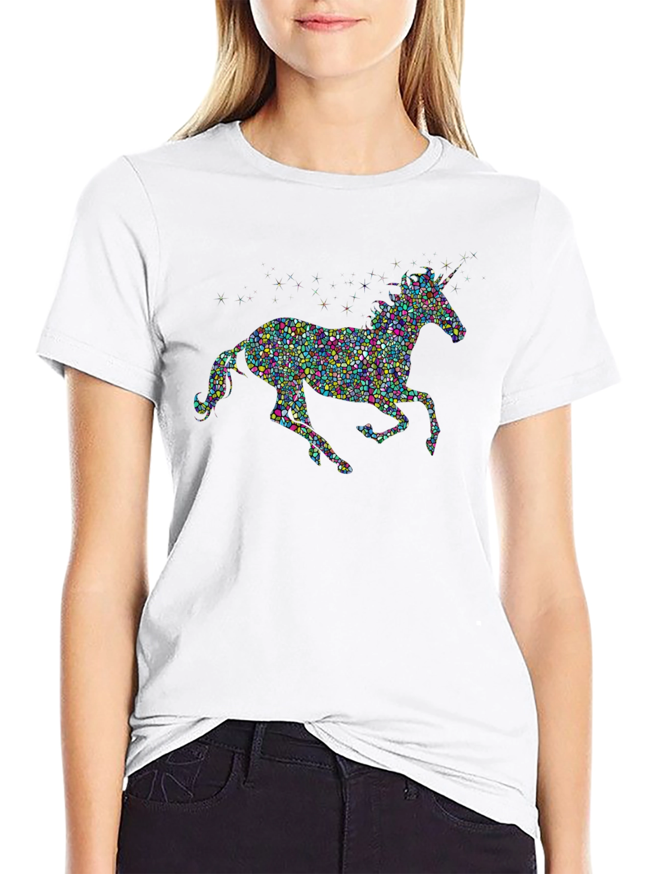 Show off your love for fantasy with this eye-catching black t-shirt. The shirt features a unique unicorn design crafted from a colorful mosaic pattern. The cotton material ensures a soft and comfortable fit. Perfect for casual wear, this tee adds a touch of whimsy to any outfit. Dress it up or down, wear it to a party or on a day out - this shirt is sure to turn heads and spark conversations. Express yourself with this stand-out piece!