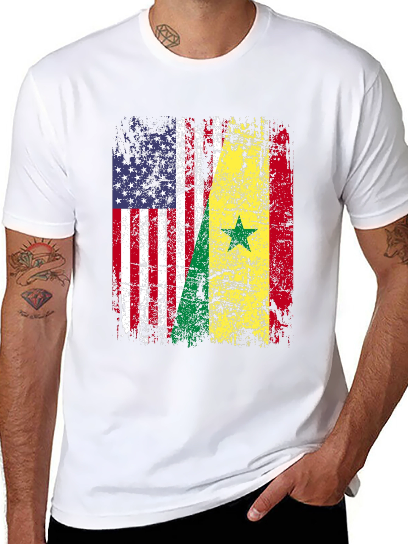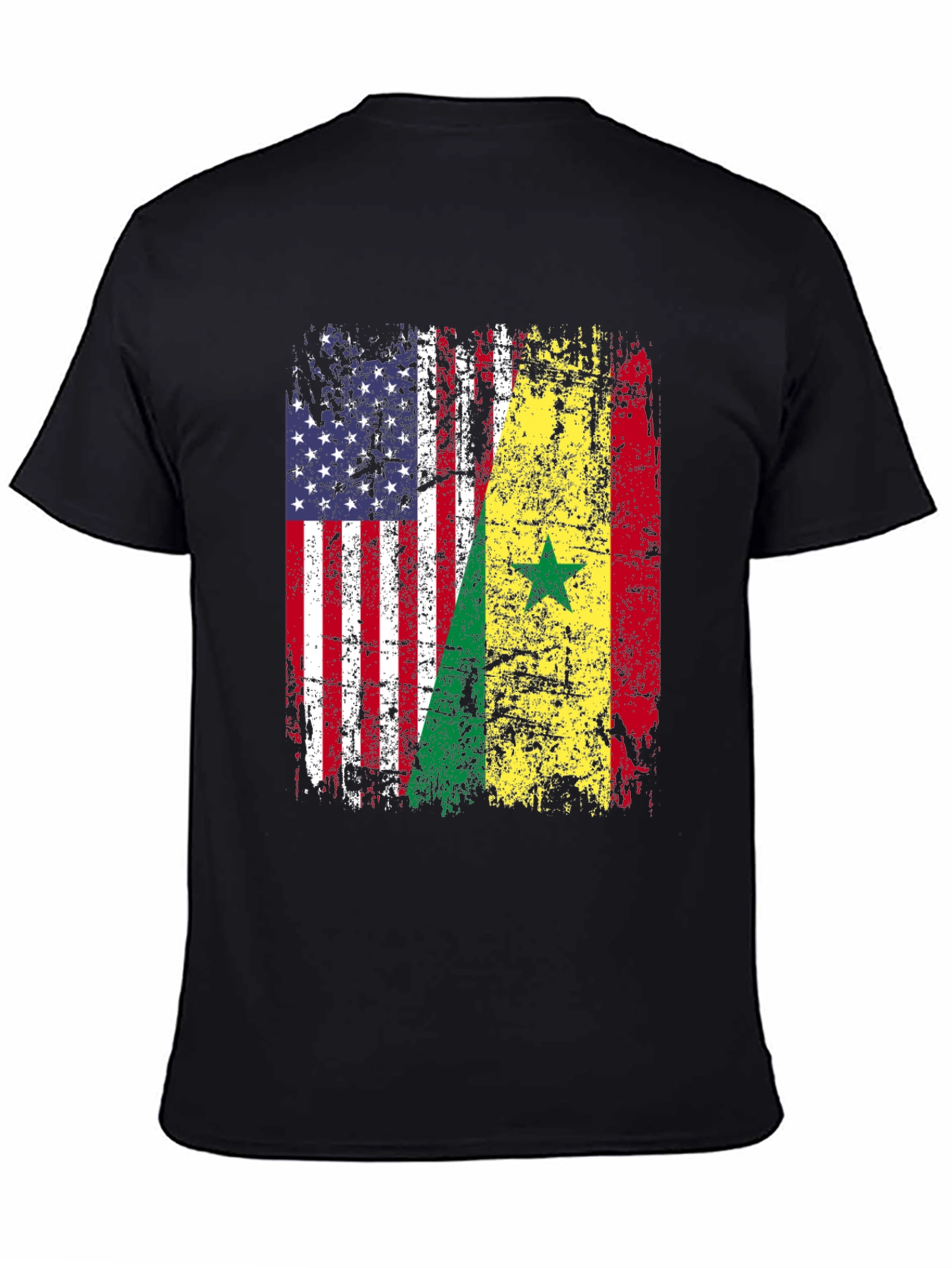 Show your dual heritage with this unique t-shirt. The design features distressed-style flags of both the United States of America and Senegal, blended together into one eye-catching graphic. The shirt appears to be made from a comfortable, breathable fabric, likely cotton or a cotton blend, ensuring all-day comfort. The bold colors of the flags – red, white, blue, yellow, green – pop against the black background of the shirt. This t-shirt is perfect for celebrating your roots, showing national pride, or simply adding a distinctive piece to your wardrobe. Ideal for casual wear, sporting events, or cultural gatherings.