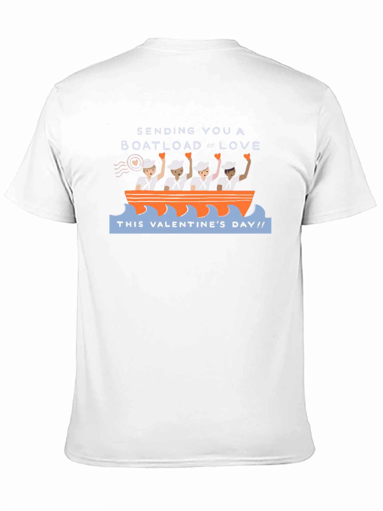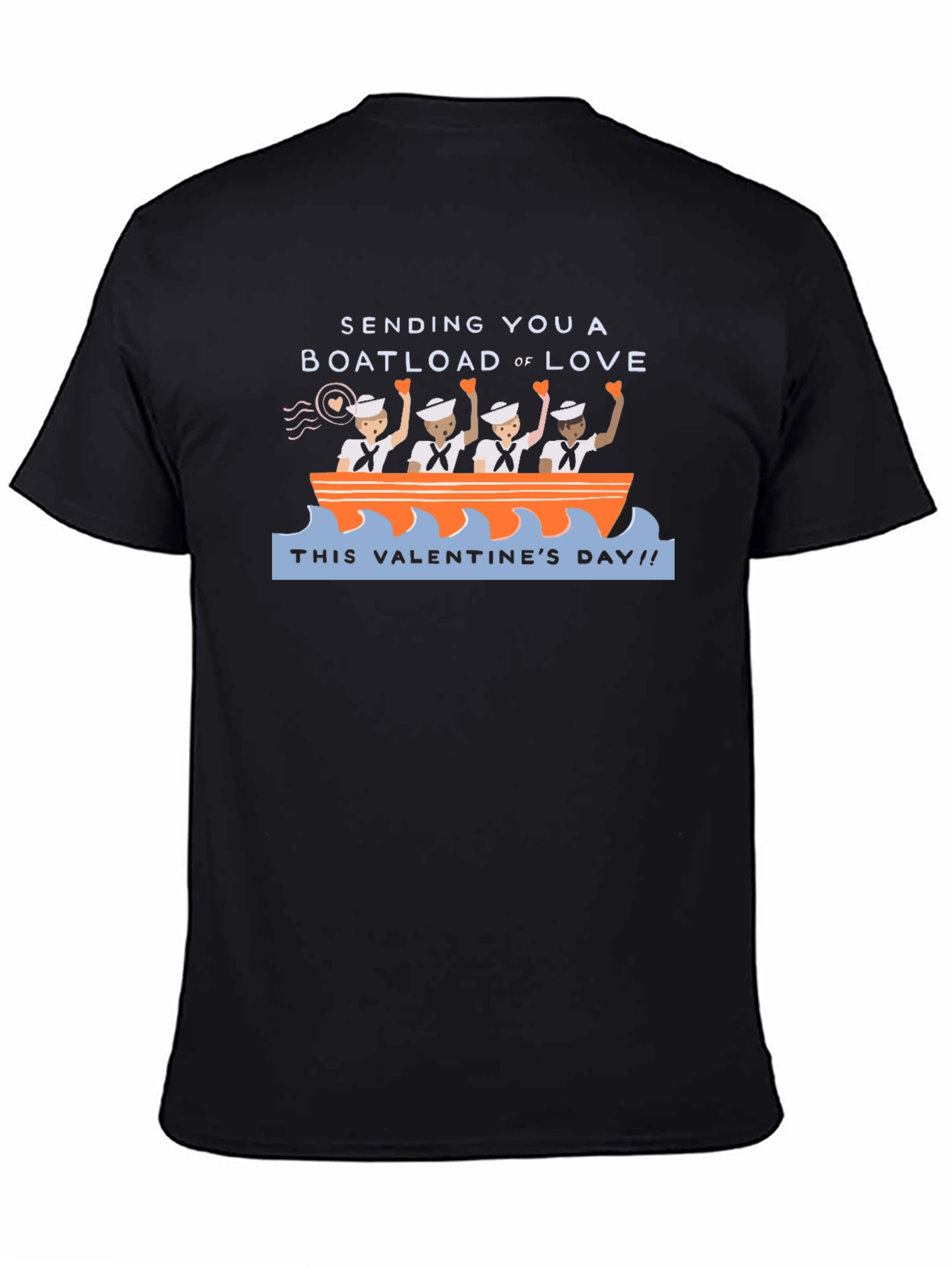 Show your love this Valentine's Day with this unique black graphic t-shirt! Featuring a charming design of sailors in a boat sending a 'boatload of love,' this tee is perfect for spreading joy and affection. The vibrant graphic stands out against the classic black backdrop, making it a stylish and eye-catching piece. Made from comfortable materials, it's ideal for everyday wear. Surprise your loved one or treat yourself to this delightful Valentine's Day tee, perfect for casual outings, parties, or cozy nights in. Share the love in style!