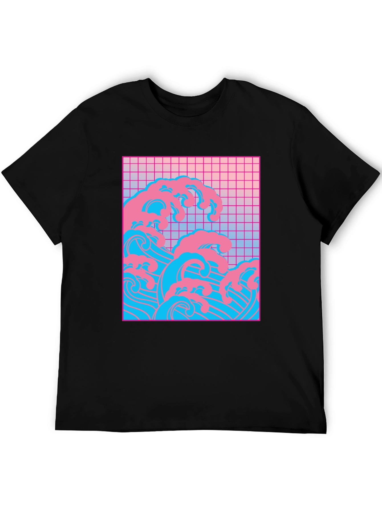 Embrace a nostalgic vibe with this eye-catching graphic tee. This black t-shirt features a vibrant vaporwave design of stylized waves against a pink and blue grid background, creating a striking visual contrast. The bold colors and retro aesthetic make it a standout piece. Made from a comfortable-looking fabric, this tee is ideal for everyday wear, casual outings, or expressing your unique style. Pair it with jeans, shorts, or joggers for a cool, relaxed look. Express your individuality with this statement shirt!