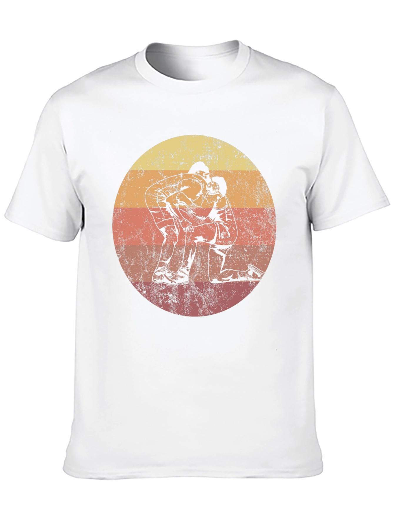 Step back in time with this vintage-style wrestling t-shirt. The black t-shirt features a distressed, retro-inspired graphic of wrestlers in action against a striped orange and yellow circle backdrop. The design adds a touch of nostalgia and athletic flair to your wardrobe. Made from a comfortable fabric, this tee is perfect for everyday wear, sports events, or casual outings. Show off your love for wrestling with this eye-catching and unique t-shirt.