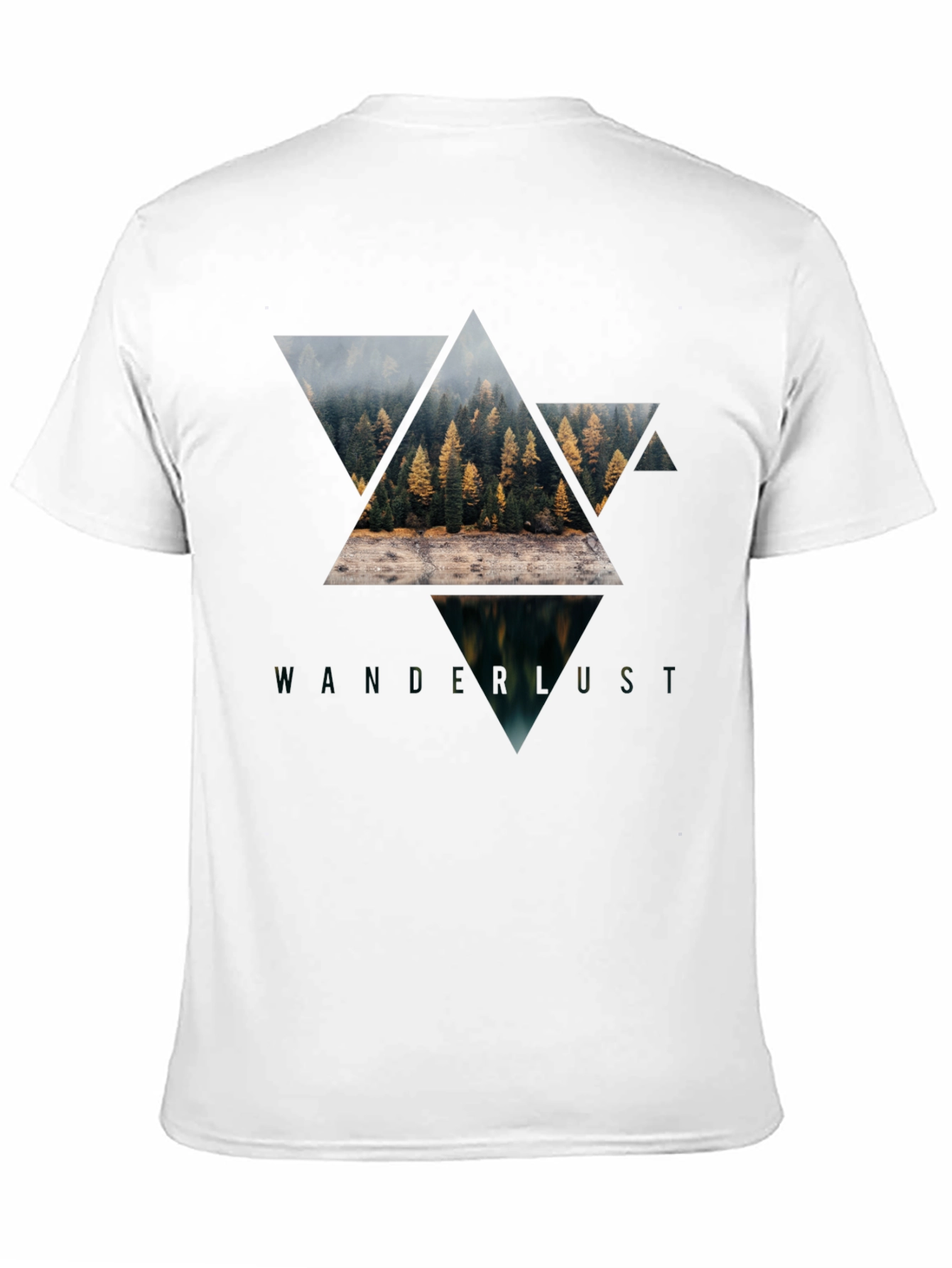 Embrace your adventurous spirit with this unique black t-shirt. Featuring a captivating graphic design of triangles filled with a stunning natural landscape scene – a serene lake surrounded by lush, misty forest. The word "Wanderlust" subtly adorns the design, inspiring you to explore the great outdoors. Made from comfortable, breathable fabric, this tee is perfect for everyday wear, hiking trips, or casual outings. Show off your love for nature and adventure with this stylish and eye-catching piece. A must-have for any nature enthusiast's wardrobe!