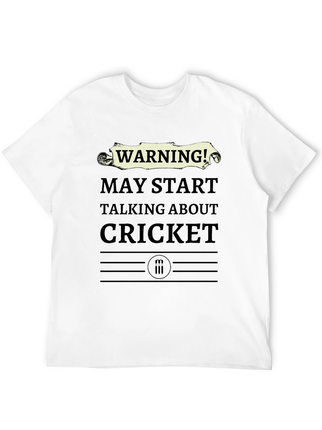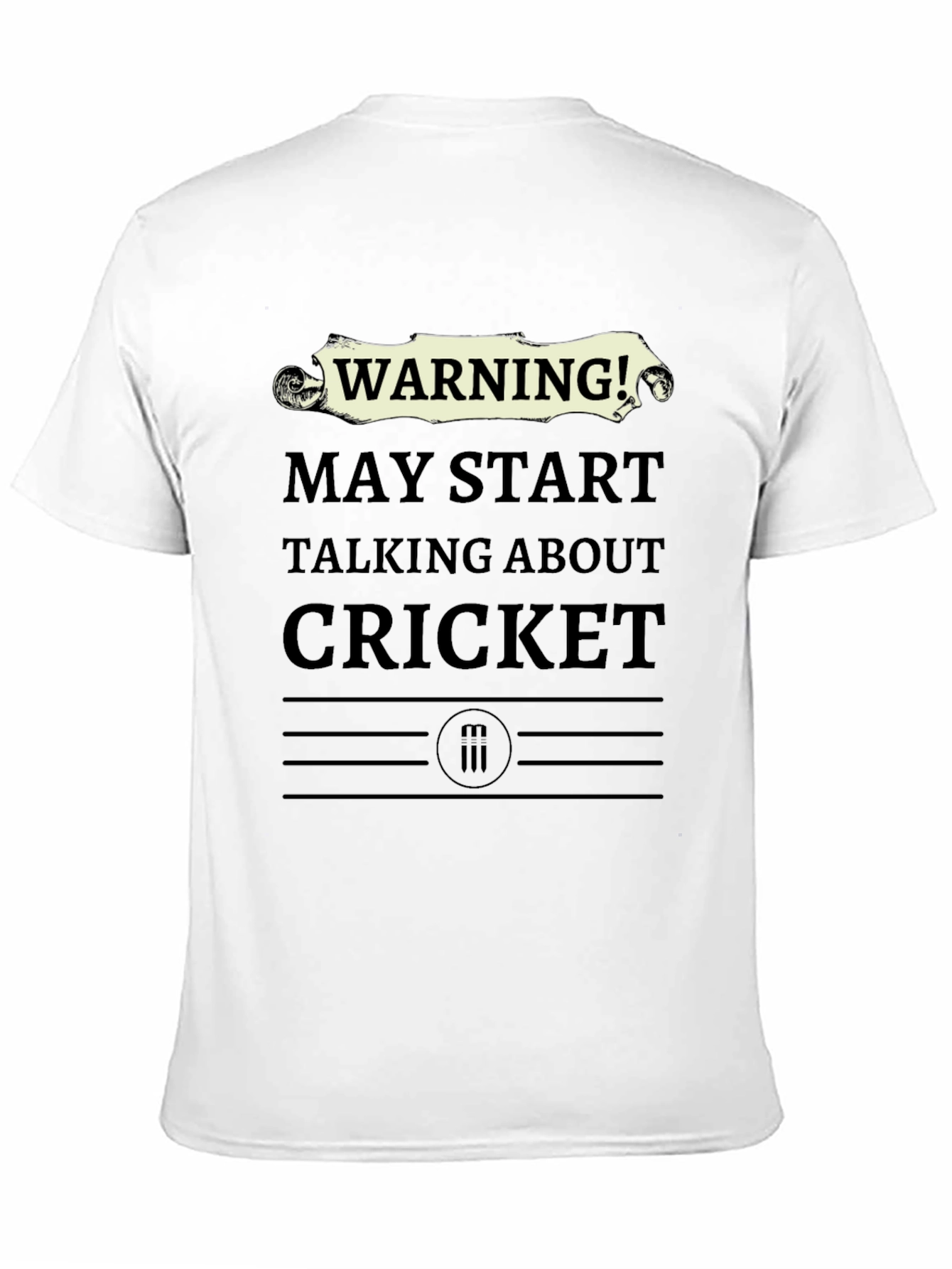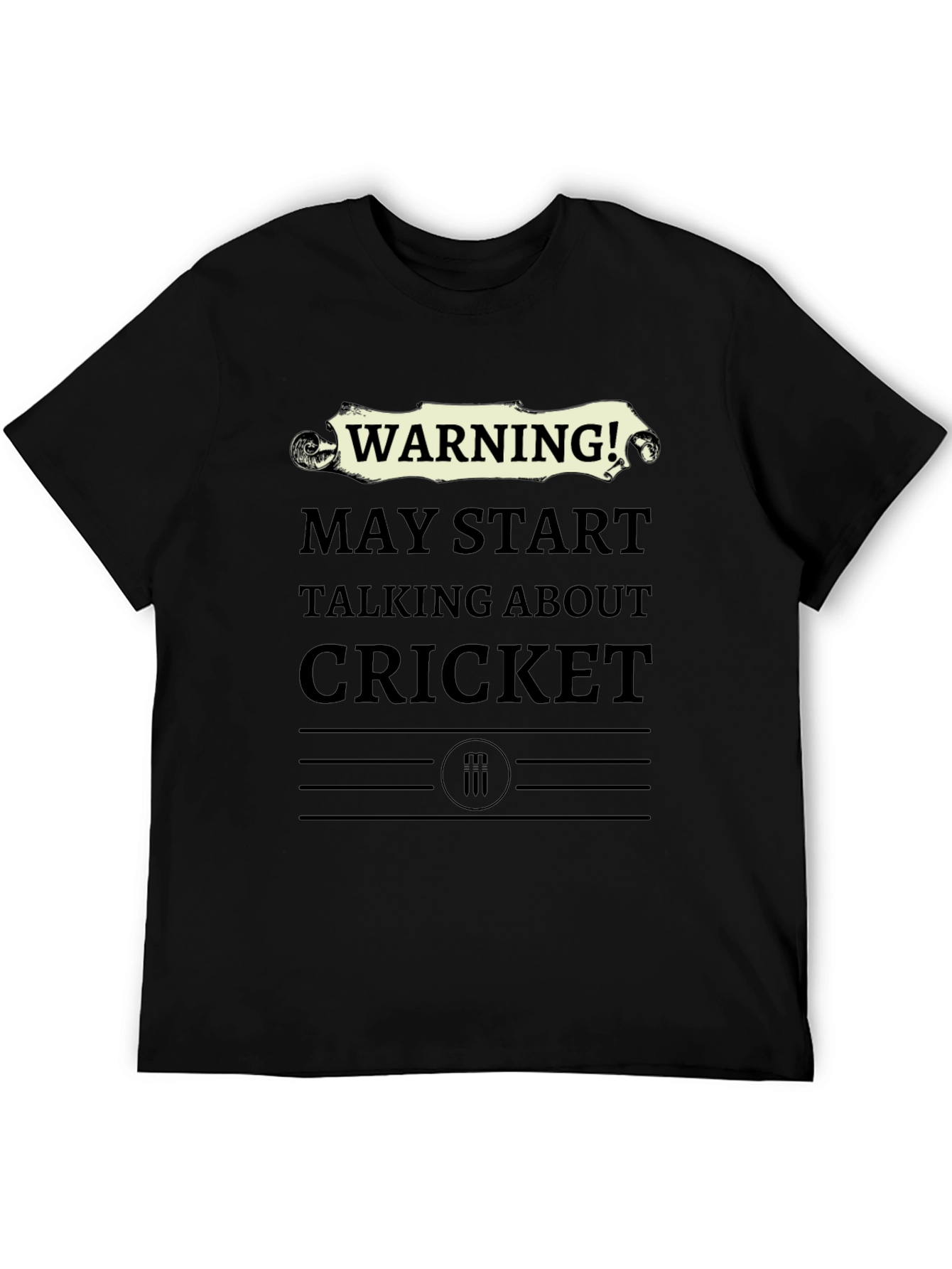 Show off your passion for Cricket with this eye-catching black t-shirt. The shirt features bold, humorous text that reads "WARNING! MAY START TALKING ABOUT CRICKET", designed to grab attention and spark conversation. Made from comfortable material, this casual tee is perfect for everyday wear, sports events, or hanging out with friends. The design also includes unique graphic elements, adding to its distinctive appeal. Ideal for cricket enthusiasts who love to share their knowledge and passion for the game. Get ready to make a statement and show your love for cricket wherever you go!