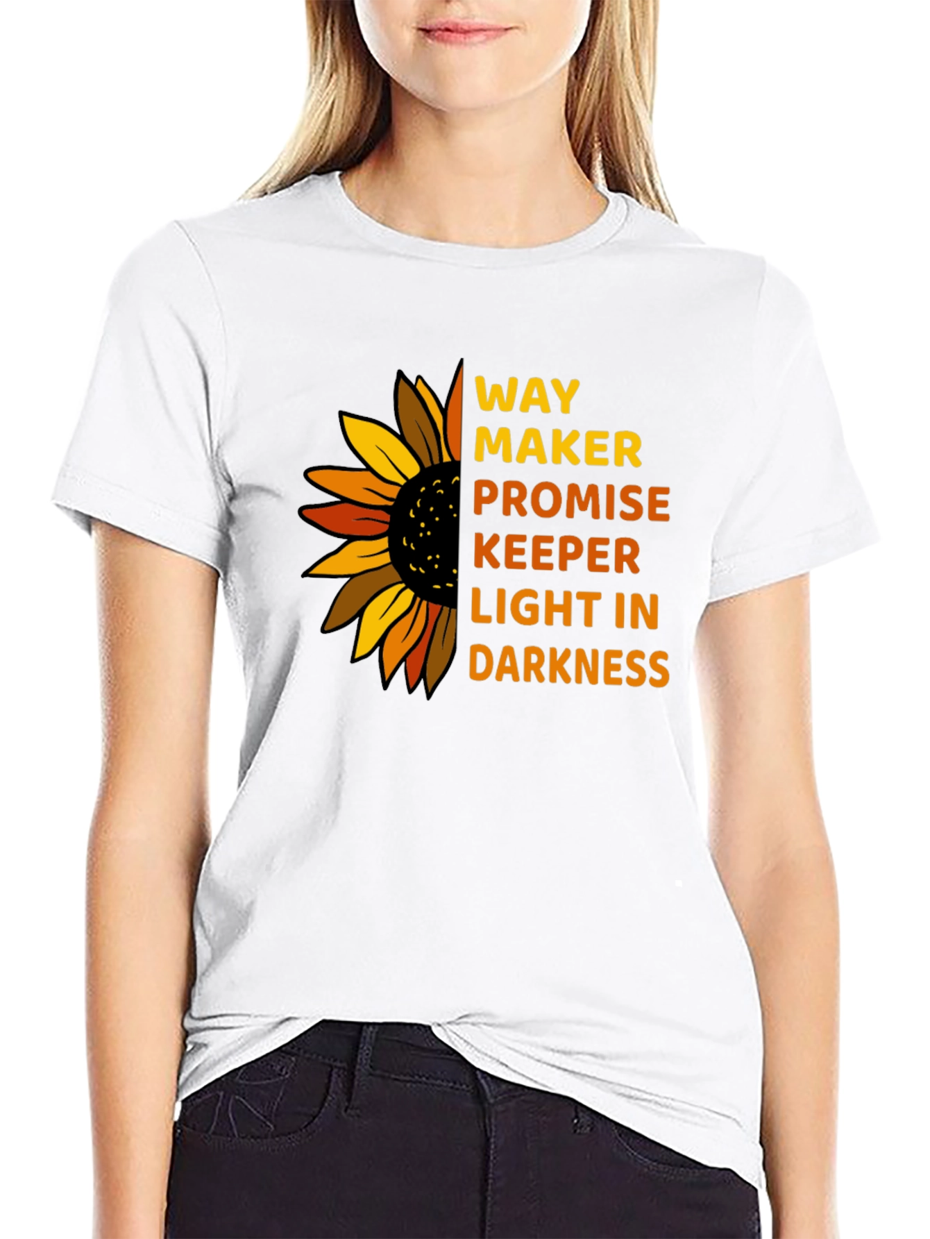 Embrace faith and style with this eye-catching black t-shirt. A beautiful sunflower design splits to reveal the inspiring words "Way Maker, Promise Keeper, Light in Darkness." The print is bright, bold, and stylish. Perfect for everyday wear, this tee is made from a comfortable fabric. Show off your faith while looking great! This casual top is sure to make a statement and spark meaningful conversations. Makes a thoughtful gift for loved ones. Grab yours today!