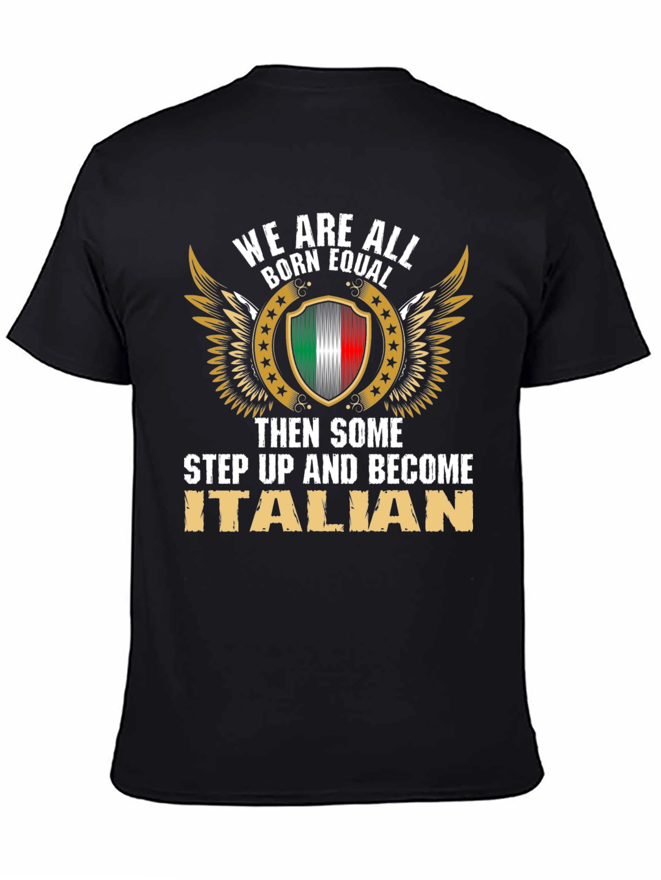 Show off your Italian pride with this bold graphic t-shirt. The design features the phrase "We Are All Born Equal" above a shield patterned with the Italian flag. Golden wings and a star-studded border add a touch of flair. Below, the words "Then Some Step Up and Become Italian" complete the statement. This tee is perfect for casual wear, Italian heritage events, or as a gift for proud Italians. Stand out from the crowd and celebrate your roots with this unique and eye-catching shirt. Get yours today and showcase your Italian pride in style!