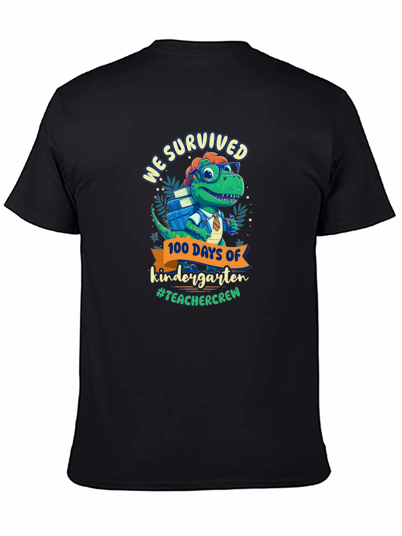 Celebrate overcoming 100 days of kindergarten with this fun black t-shirt. Featuring a cartoon dinosaur wearing glasses, carrying books, and dressed in a suit, this tee is perfect for teachers and students alike. The design also includes the phrases "WE SURVIVED", "100 DAYS OF kindergarten", and "#TEACHERCREW" in vibrant colors, making it a standout piece. Made from comfortable material, this shirt is great for everyday wear, school events, or as a unique gift. Show off your accomplishment with pride!