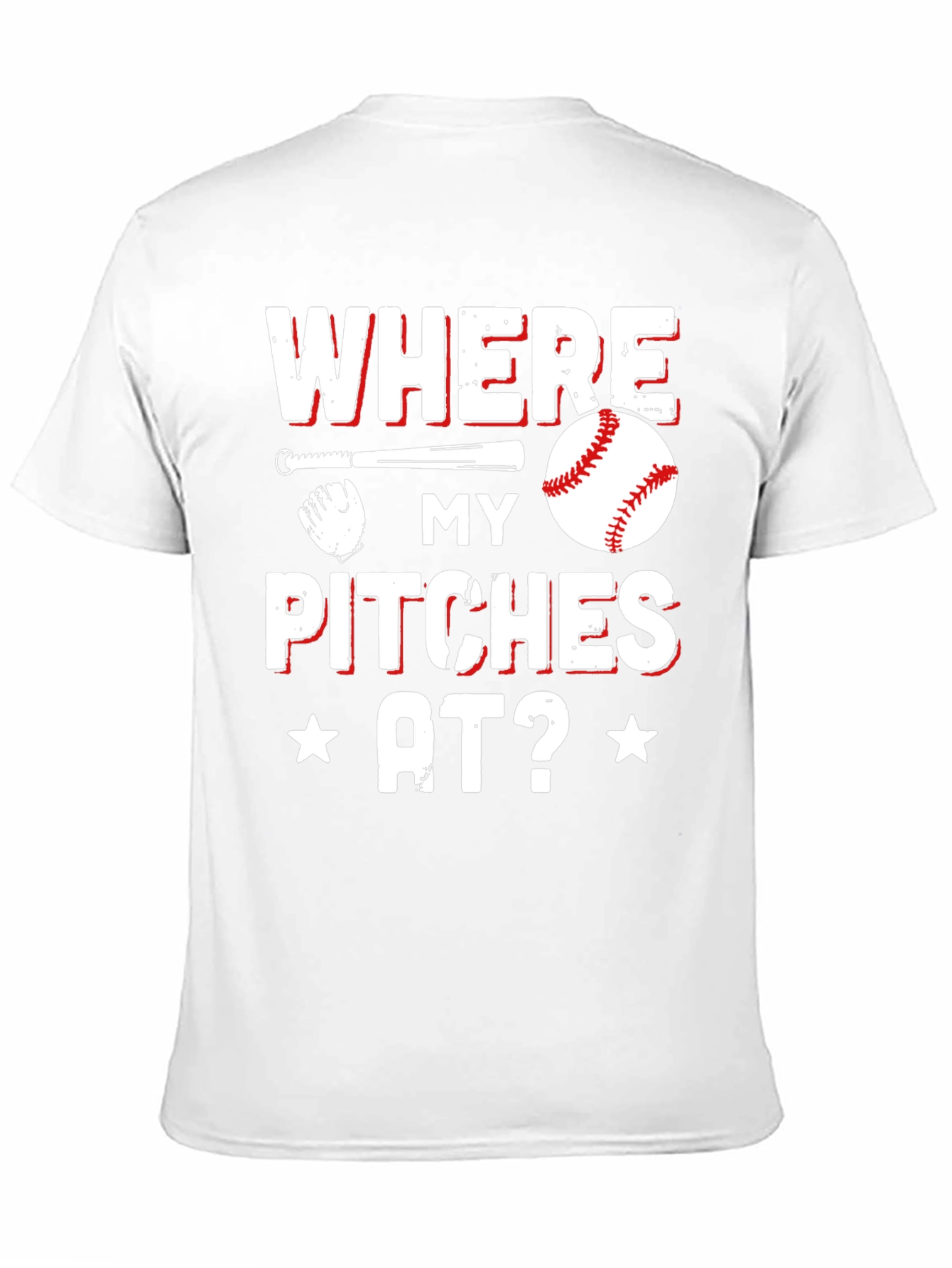 Show off your love for baseball with this eye-catching t-shirt! Featuring a bold, distressed print that reads "WHERE MY PITCHES AT?", this tee is perfect for players and fans alike. The design incorporates a baseball, bat, and glove graphic, adding to the sporty appeal. Made from a comfortable, breathable fabric, this t-shirt is ideal for wearing to games, practices, or casual outings. Its relaxed fit ensures all-day comfort, while the durable print ensures long-lasting wear. Makes a great gift for baseball enthusiasts! Wear your passion for the sport.