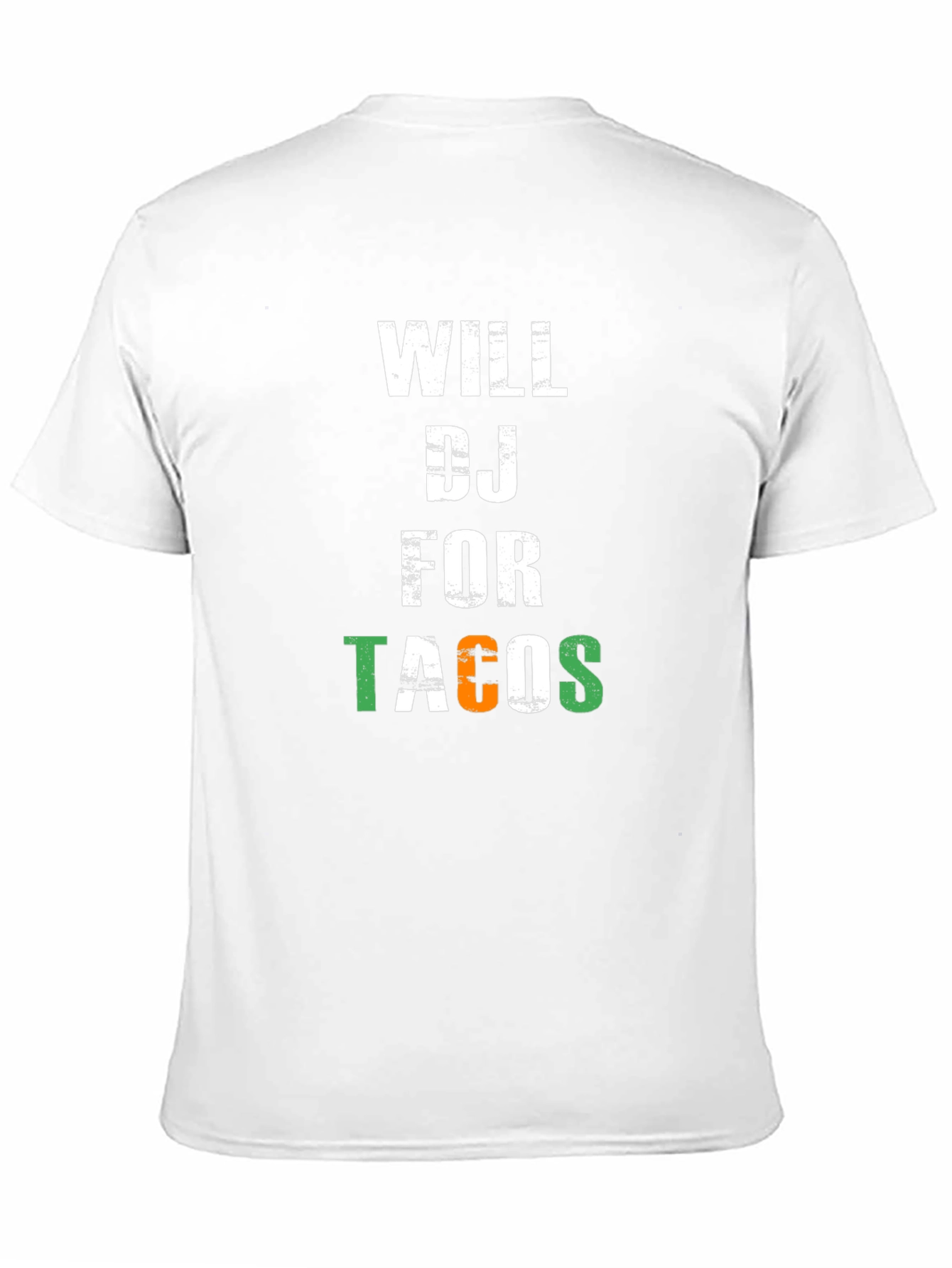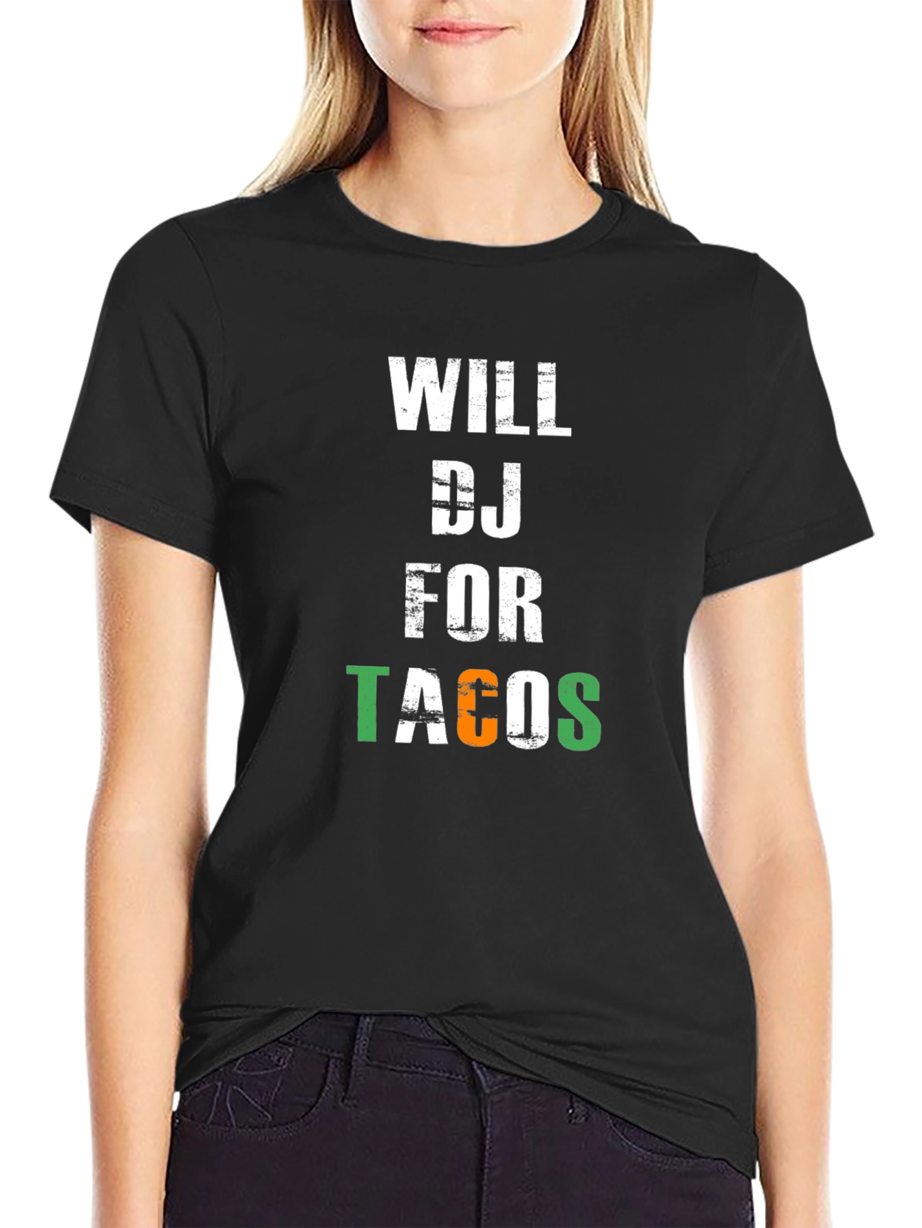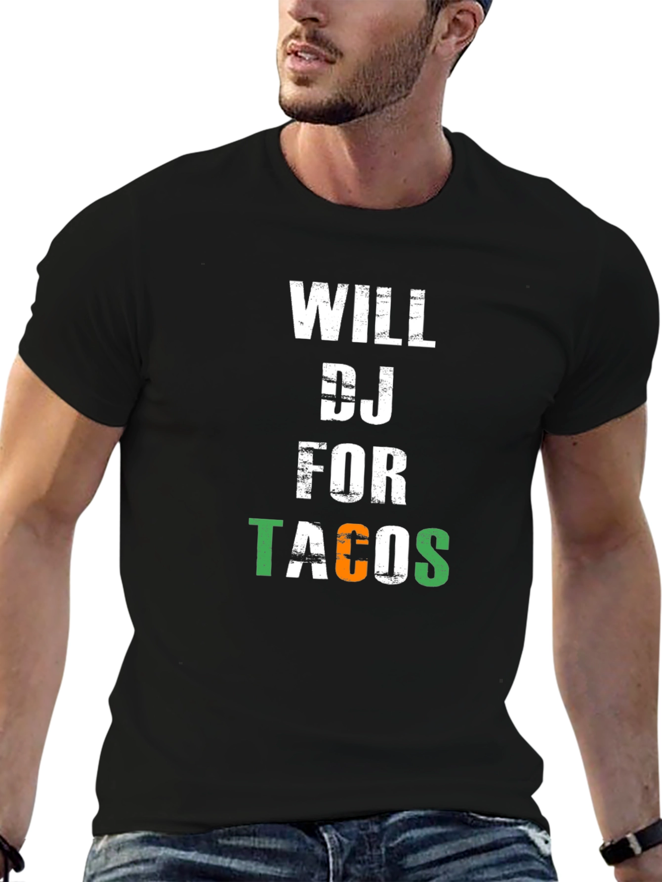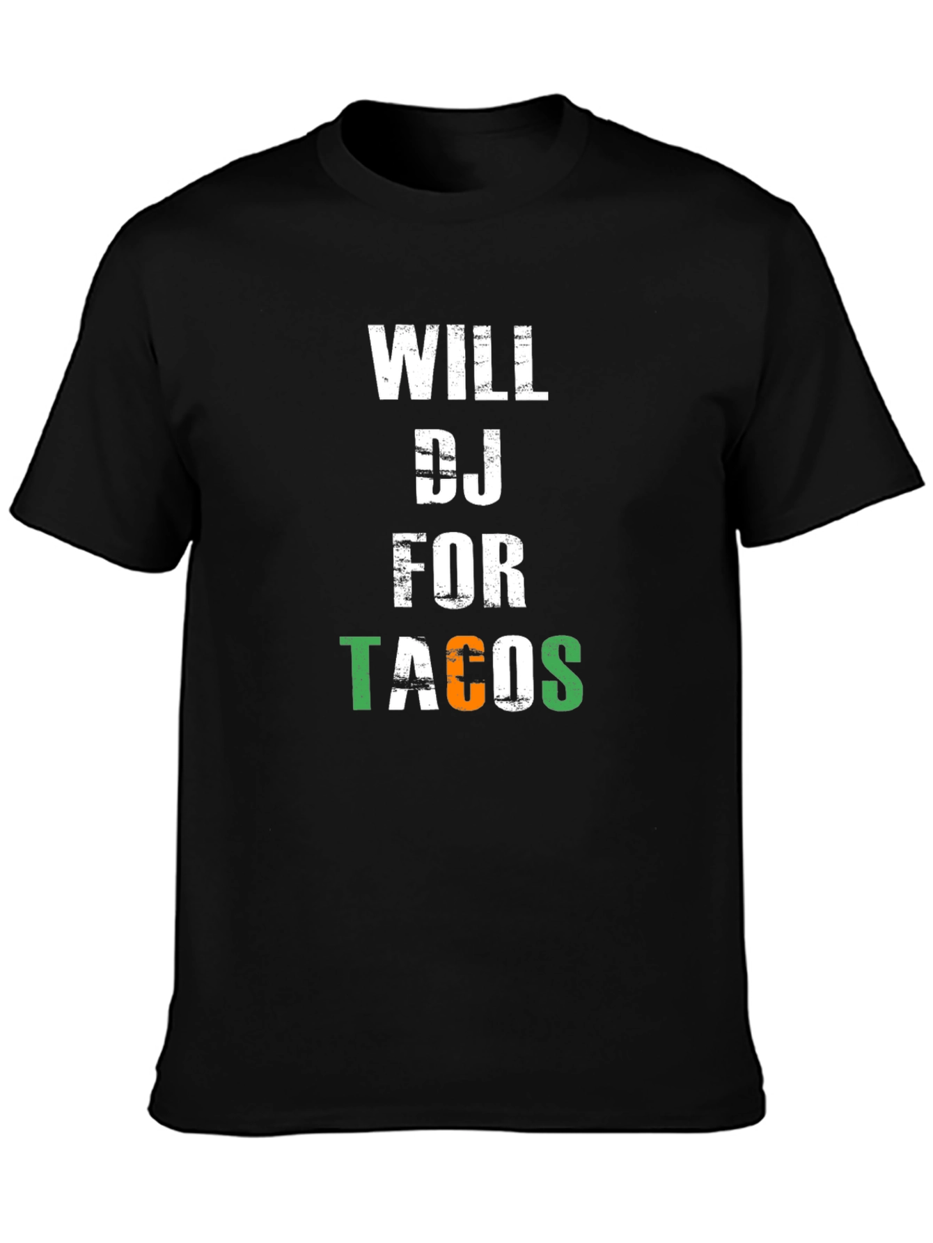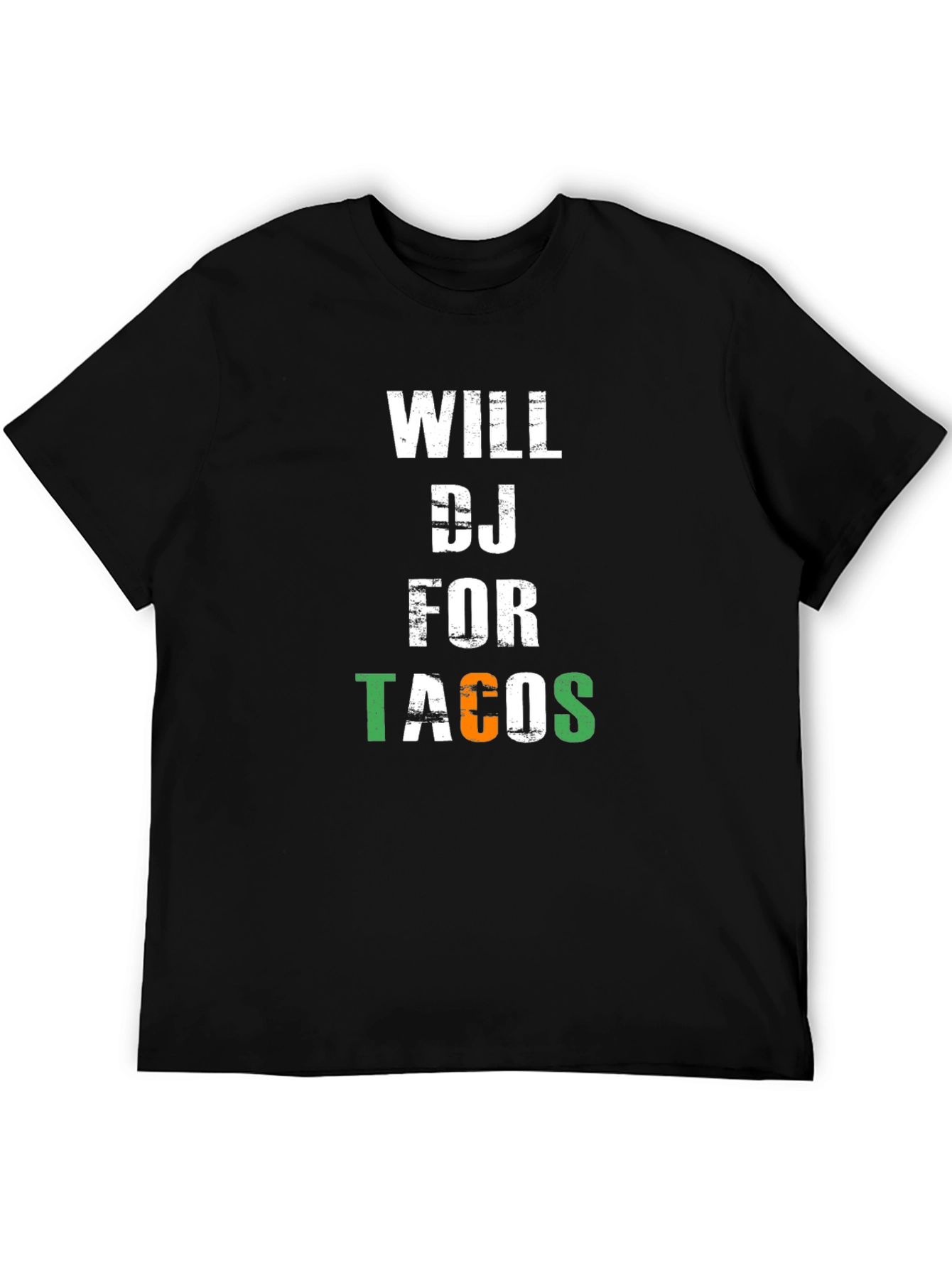 Show off your love for music and Mexican food with this fun graphic t-shirt. The design features the phrase "Will DJ for Tacos" in bold, eye-catching lettering. The word "Tacos" features the colors of the Mexican flag. Made from a comfortable black material, this short-sleeve tee is perfect for casual wear, DJ gigs, or taco Tuesday celebrations. It's a great conversation starter and a must-have for any taco-loving DJ. Get yours today and let everyone know your price for laying down the beats!