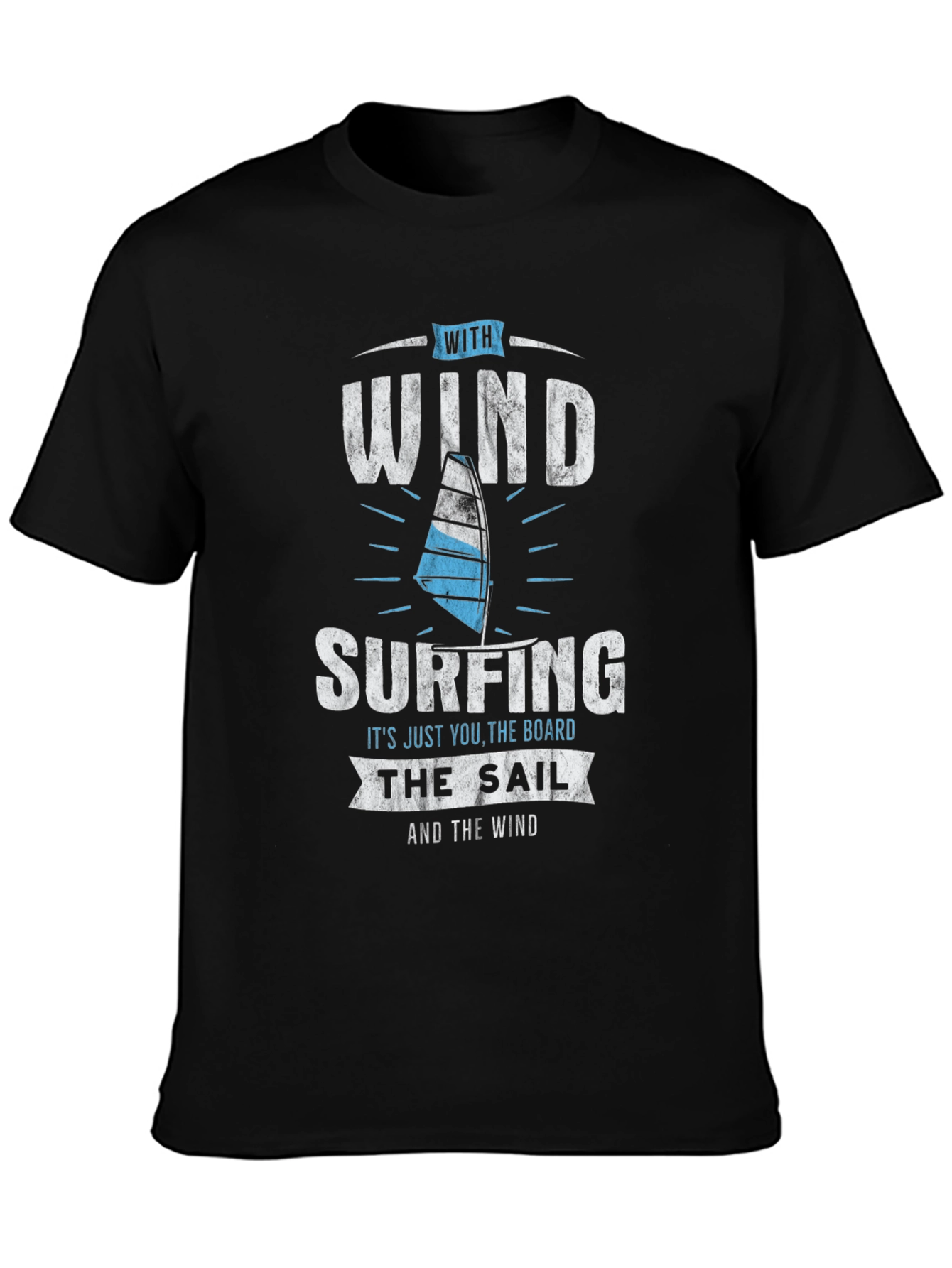Embrace your love for windsurfing with this stylish black t-shirt! Featuring a striking design with the words 'WITH WIND SURFING' and a graphic of a windsurf sail, this tee is perfect for any watersport enthusiast. The shirt also includes the phrase 'IT'S JUST YOU, THE BOARD THE SAIL AND THE WIND,' adding a touch of adventure and freedom. Made from a comfortable, breathable fabric, this shirt is great for everyday wear, beach outings, or casual gatherings with fellow windsurfing fans. Show off your passion for the wind and waves with this unique and eye-catching t-shirt.