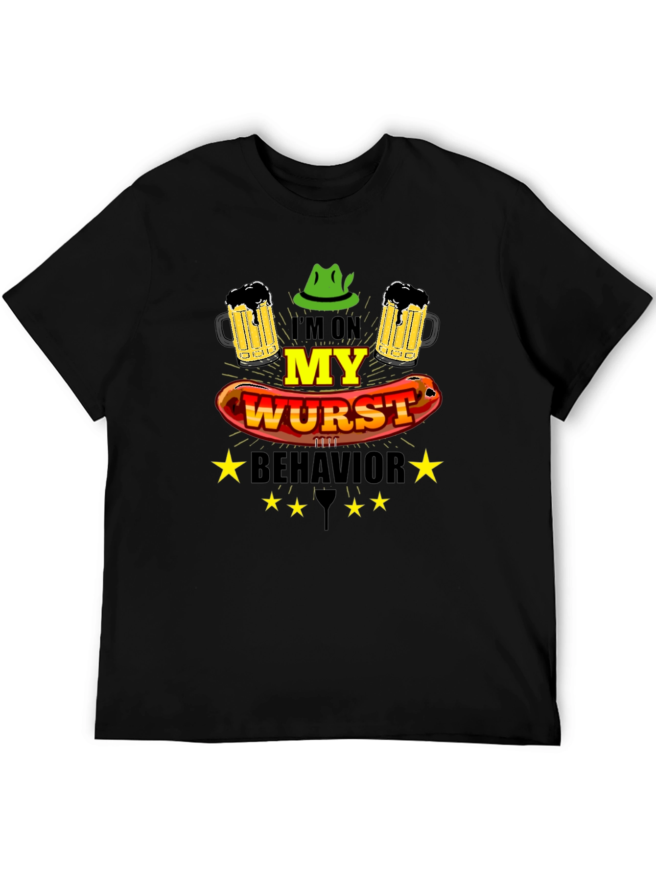 Show off your fun side with this hilarious 'I'm On My Worst Behavior' Oktoberfest t-shirt! The black tee features a bold graphic with beer mugs, a Bavarian hat, and a sausage. Perfect for Oktoberfest celebrations, beer festivals, or casual wear, this shirt is sure to get a laugh and make you the life of the party. The design is eye-catching and printed on what appears to be a soft, comfortable fabric, ensuring you can wear it all day and night. Get ready to embrace your 'worst' behavior in style and comfort! This tee would make a great gift for beer lovers.