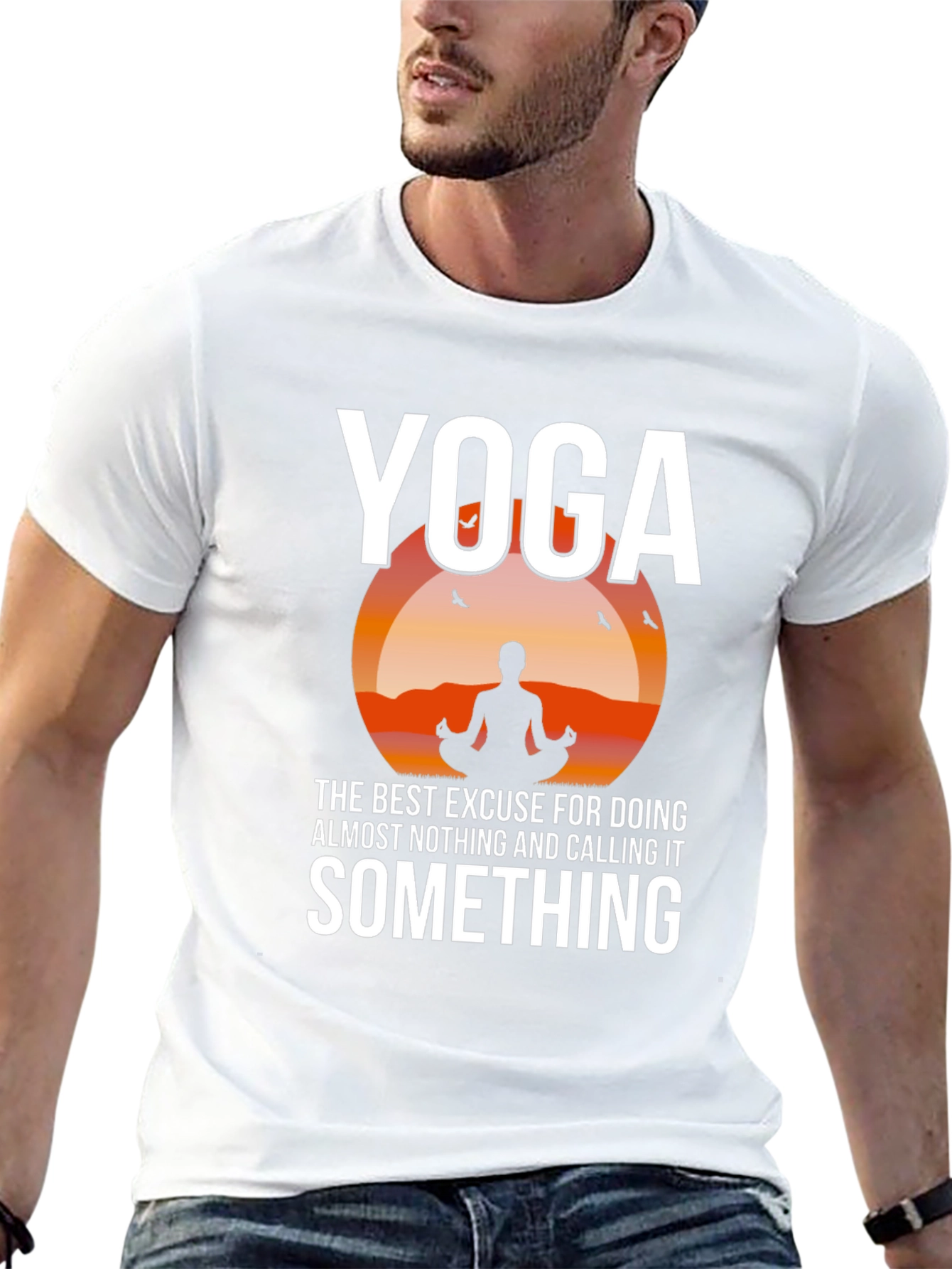 Embrace relaxation with this fun black T-shirt. Featuring a striking sunset graphic with a meditating silhouette, this shirt humorously states, "Yoga: The Best Excuse For Doing Almost Nothing And Calling It Something." Perfect for yoga enthusiasts or anyone who appreciates a comfy and humorous tee. Made from a soft fabric blend, it's ideal for casual wear, yoga sessions, or lounging at home. A great conversation starter and a unique addition to any wardrobe.