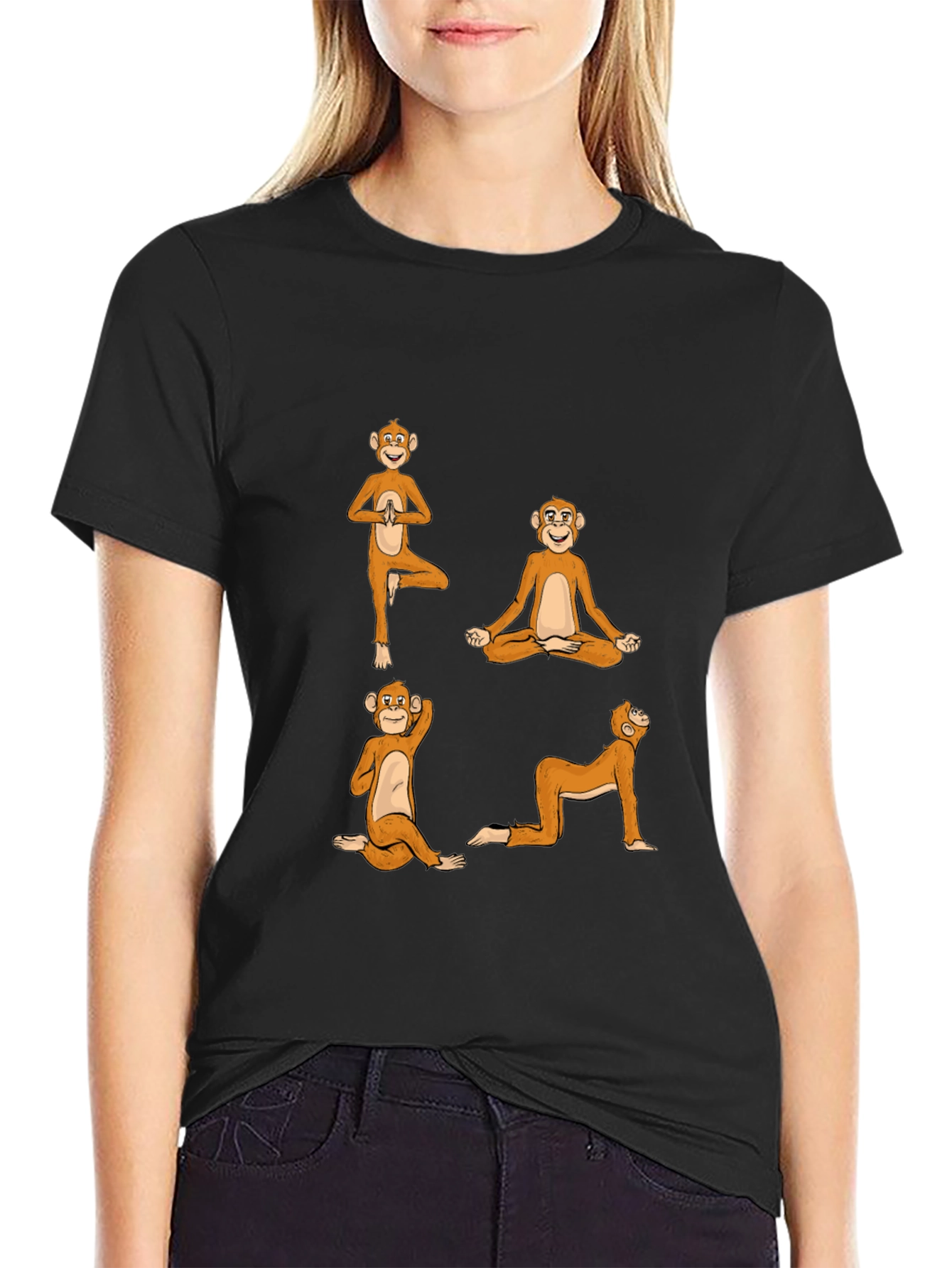 This black t-shirt features a playful design of monkeys in various yoga poses. The light brown monkey figures are centered on the chest. The tee is a classic crew neck style with short sleeves, suitable for casual wear or workouts. The design adds a touch of humor to everyday outfits. The t-shirt is made of a soft and breathable material, likely cotton or a cotton blend, ensuring comfort. It's an ideal gift for yoga enthusiasts or anyone who loves fun graphic tees. Pair it with jeans or leggings for a relaxed look.